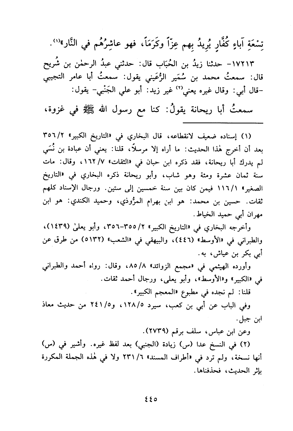 ١٧٢١٣ - حَدَّثَنَا زَيْدُ بْنُ الْحُبَابِ، قَالَ: حَدَّثَنِي عَبْدُ الرَّحْمَنِ بْنُ شُرَيْحٍ، قَالَ: سَمِعْتُ مُحَمَّدَ بْنَ سُمَيْرٍ الرُّعَيْنِيَّ، يَقُولُ: سَمِعْتُ أَبَا عَامِرٍ التُّجِيبِيَّ، قَالَ أَبِي: " وَقَالَ غَيْرُهُ يَعْنِي (٢) غَيْرَ زَيْدٍ: أَبُو عَلِيٍّ الْجَنَبِيُّ " يَقُولُ: سَمِعْتُ أَبَا رَيْحَانَةَ، يَقُولُ: كُنَّا مَعَ رَسُولِ اللهِ صَلَّى اللهُ عَلَيْهِ وَسَلَّمَ فِي غَزْوَةٍ،