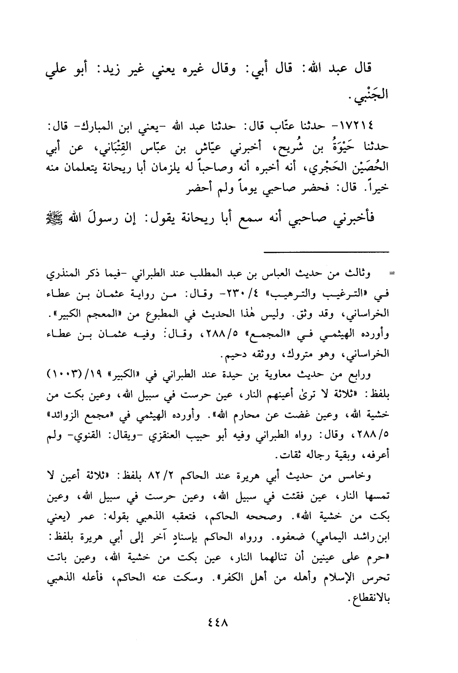 ١٧٢١٤ - حَدَّثَنَا عَتَّابٌ، قَالَ: حَدَّثَنَا عَبْدُ اللهِ يَعْنِي ابْنَ الْمُبَارَكِ، قَالَ: حَدَّثَنَا حَيْوَةُ بْنُ شُرَيْحٍ، أَخْبَرَنِي عَيَّاشُ بْنُ عَبَّاسٍ الْقِتْبَانِيُّ، عَنْ أَبِي الْحُصَيْنِ الْحَجْرِيِّ، أَنَّهُ أَخْبَرَهُ أَنَّهُ وَصَاحِبًا لَهُ يَلْزَمَانِ أَبَا رَيْحَانَةَ يَتَعَلَّمَانِ مِنْهُ خَيْرًا. قَالَ: فَحَضَرَ صَاحِبِي يَوْمًا وَلَمْ أَحْضُرْ، فَأَخْبَرَنِي صَاحِبِي، أَنَّهُ سَمِعَ أَبَا رَيْحَانَةَ، يَقُولُ: " إِنَّ رَسُولَ اللهِ صَلَّى اللهُ عَلَيْهِ وَسَلَّمَ