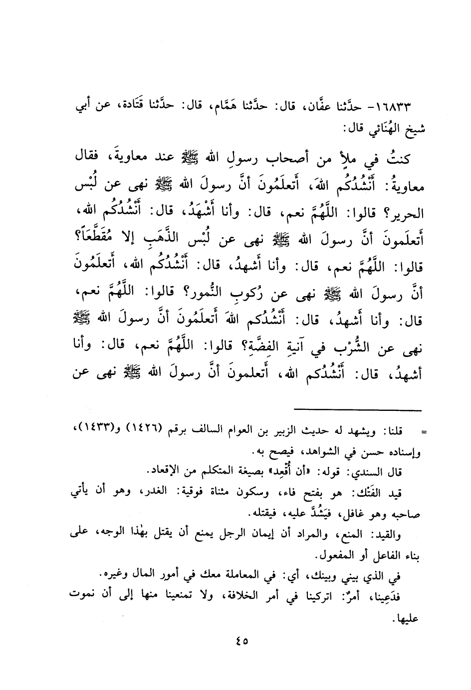 ١٦٨٣٣ - حَدَّثَنَا عَفَّانُ، قَالَ: حَدَّثَنَا هَمَّامٌ، قَالَ: حَدَّثَنَا قَتَادَةُ، عَنْ أَبِي شَيْخٍ الْهُنَائِيِّ، قَالَ: كُنْتُ فِي مَلَأٍ مِنْ أَصْحَابِ رَسُولِ اللهِ صَلَّى اللهُ عَلَيْهِ وَسَلَّمَ عِنْدَ مُعَاوِيَةَ، فَقَالَ مُعَاوِيَةُ: أَنْشُدُكُمُ اللهَ، أَتَعْلَمُونَ أَنَّ رَسُولَ اللهِ صَلَّى اللهُ عَلَيْهِ وَسَلَّمَ " نَهَى عَنْ لُبْسِ الْحَرِيرِ؟ " قَالُوا: اللهُمَّ نَعَمْ، قَالَ: وَأَنَا أَشْهَدُ، قَالَ: أَنْشُدُكُمُ اللهَ، أَتَعْلَمُونَ أَنَّ رَسُولَ اللهِ صَلَّى اللهُ عَلَيْهِ وَسَلَّمَ " نَهَى عَنْ لُبْسِ الذَّهَبِ إِلَّا مُقَطَّعًا؟ " قَالُوا: اللهُمَّ نَعَمْ، قَالَ: وَأَنَا أَشْهَدُ، قَالَ: أَنْشُدُكُمُ اللهَ، أَتَعْلَمُونَ أَنَّ رَسُولَ اللهِ صَلَّى اللهُ عَلَيْهِ وَسَلَّمَ " نَهَى عَنْ رُكُوبِ النُّمُورِ؟ " قَالُوا: اللهُمَّ نَعَمْ، قَالَ: وَأَنَا أَشْهَدُ، قَالَ: أَنْشُدُكُمُ اللهَ، أَتَعْلَمُونَ أَنَّ رَسُولَ اللهِ صَلَّى اللهُ عَلَيْهِ وَسَلَّمَ " نَهَى عَنِ الشُّرْبِ فِي آنِيَةِ الْفِضَّةِ؟ " قَالُوا: اللهُمَّ نَعَمْ، قَالَ: وَأَنَا أَشْهَدُ، قَالَ: أَنْشُدُكُمُ اللهَ، أَتَعْلَمُونَ أَنَّ رَسُولَ اللهِ صَلَّى اللهُ عَلَيْهِ وَسَلَّمَ " نَهَى عَنْ