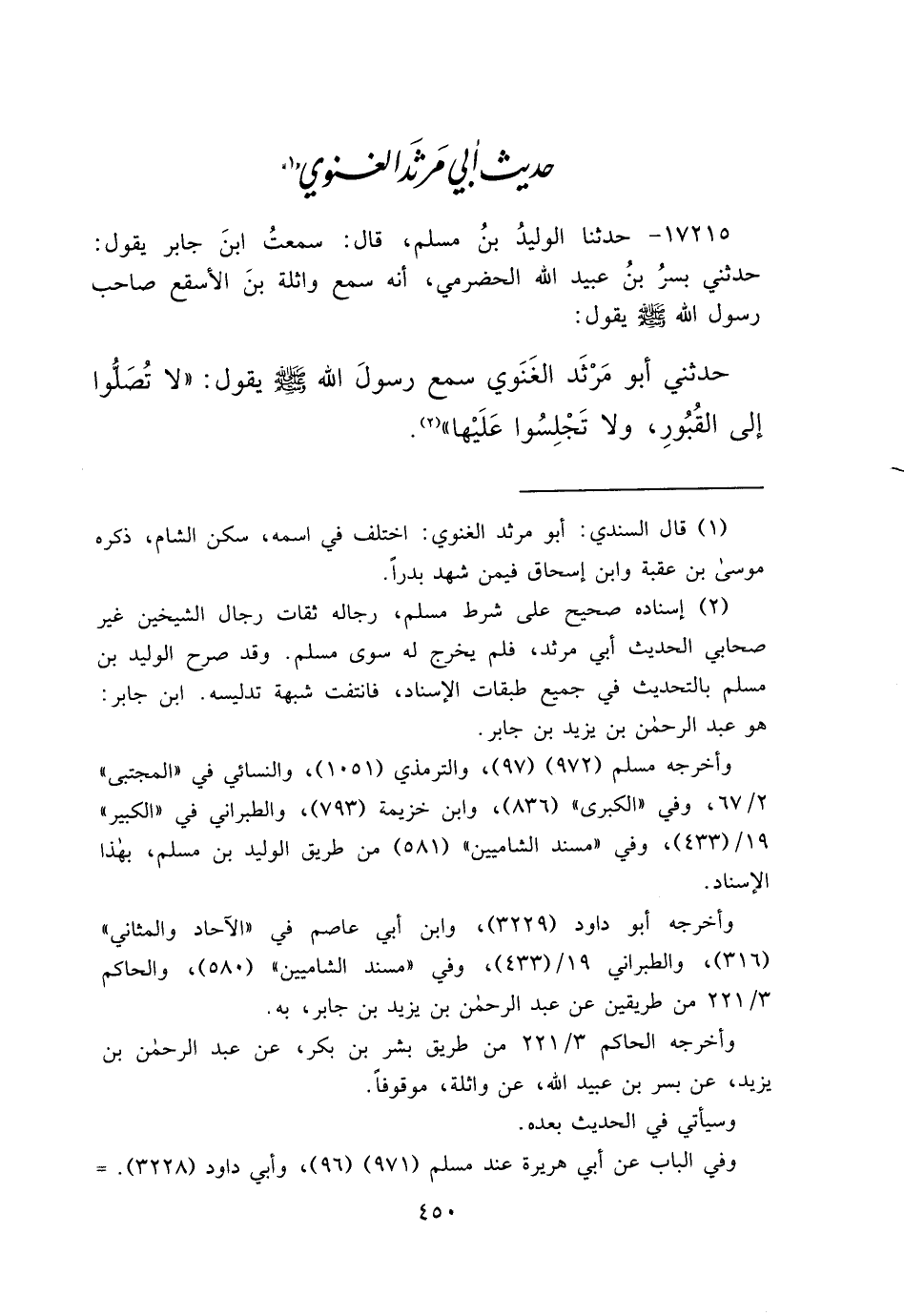 ١٧٢١٥ - حَدَّثَنَا الْوَلِيدُ بْنُ مُسْلِمٍ، قَالَ: سَمِعْتُ ابْنَ جَابِرٍ، يَقُولُ: حَدَّثَنِي بُسْرُ بْنُ عُبَيْدِ اللهِ الْحَضْرَمِيُّ، أَنَّهُ سَمِعَ وَاثِلَةَ بْنَ الْأَسْقَعِ، صَاحَبَ رَسُولِ اللهِ صَلَّى اللهُ عَلَيْهِ وَسَلَّمَ يَقُولُ: حَدَّثَنِي أَبُو مَرْثَدٍ الْغَنَوِيُّ، سَمِعَ رَسُولَ اللهِ صَلَّى اللهُ عَلَيْهِ وَسَلَّمَ يَقُولُ: " لَا تُصَلُّوا إِلَى الْقُبُورِ، وَلَا تَجْلِسُوا عَلَيْهَا " (٢)
