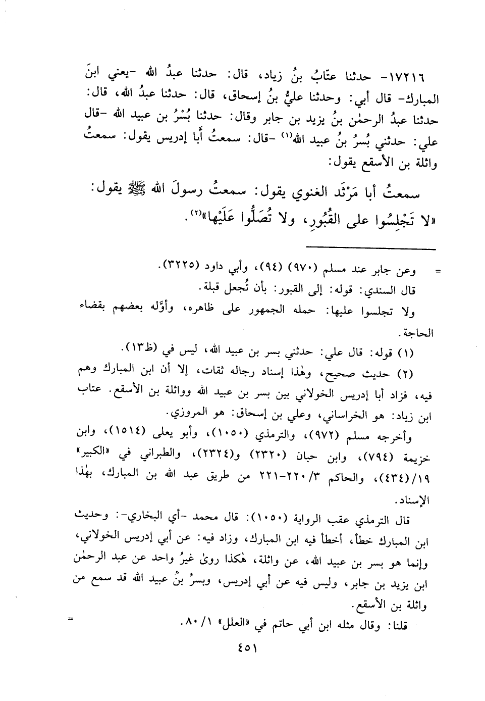 ١٧٢١٦ - حَدَّثَنَا عَتَّابُ بْنُ زِيَادٍ، قَالَ: حَدَّثَنَا عَبْدُ اللهِ يَعْنِي ابْنَ الْمُبَارَكِ، قَالَ أَبِي: وحَدَّثَنَا عَلِيُّ بْنُ إِسْحَاقَ، قَالَ: حَدَّثَنَا عَبْدُ اللهِ، قَالَ: حَدَّثَنَا عَبْدُ الرَّحْمَنِ بْنُ يَزِيدَ بْنِ جَابِرٍ، وَقَالَ: حَدَّثَنَا بُسْرُ بْنُ عُبَيْدِ اللهِ، قَالَ عَلِيٌّ: حَدَّثَنِي بُسْرُ بْنُ عُبَيْدِ اللهِ (١) ، قَالَ: سَمِعْتُ أَبَا إِدْرِيسَ، يَقُولُ سَمِعْتُ وَاثِلَةَ بْنَ الْأَسْقَعِ، يَقُولُ: سَمِعْتُ أَبَا مَرْثَدٍ الْغَنَوِيَّ، يَقُولُ: سَمِعْتُ رَسُولَ اللهِ صَلَّى اللهُ عَلَيْهِ وَسَلَّمَ يَقُولُ: " لَا تَجْلِسُوا عَلَى الْقُبُورِ، وَلَا تُصَلُّوا عَلَيْهَا " (٢)