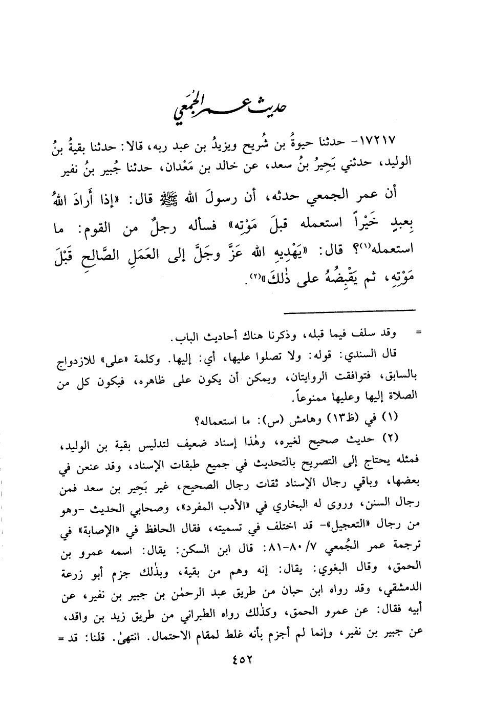١٧٢١٧ - حَدَّثَنَا حَيْوَةُ بْنُ شُرَيْحٍ، وَيَزِيدُ بْنُ عَبْدِ رَبِّهِ، قَالَا: حَدَّثَنَا بَقِيَّةُ بْنُ الْوَلِيدِ، حَدَّثَنِي بَحِيرُ بْنُ سَعْدٍ، عَنْ خَالِدِ بْنِ مَعْدَانَ، حَدَّثَنَا جُبَيْرُ بْنُ نُفَيْرٍ، أَنَّ عُمَرَ الْجُمَعِيَّ، حَدَّثَهُ، أَنَّ رَسُولَ اللهِ صَلَّى اللهُ عَلَيْهِ وَسَلَّمَ قَالَ: " إِذَا أَرَادَ اللهُ بِعَبْدٍ خَيْرًا اسْتَعْمَلَهُ قَبْلَ مَوْتِهِ " فَسَأَلَهُ رَجُلٌ مِنَ الْقَوْمِ: مَا اسْتَعْمَلَهُ (١) ؟ قَالَ: " يَهْدِيهِ اللهُ عَزَّ وَجَلَّ إِلَى الْعَمَلِ الصَّالِحِ قَبْلَ مَوْتِهِ، ثُمَّ يَقْبِضُهُ عَلَى ذَلِكَ " (٢)