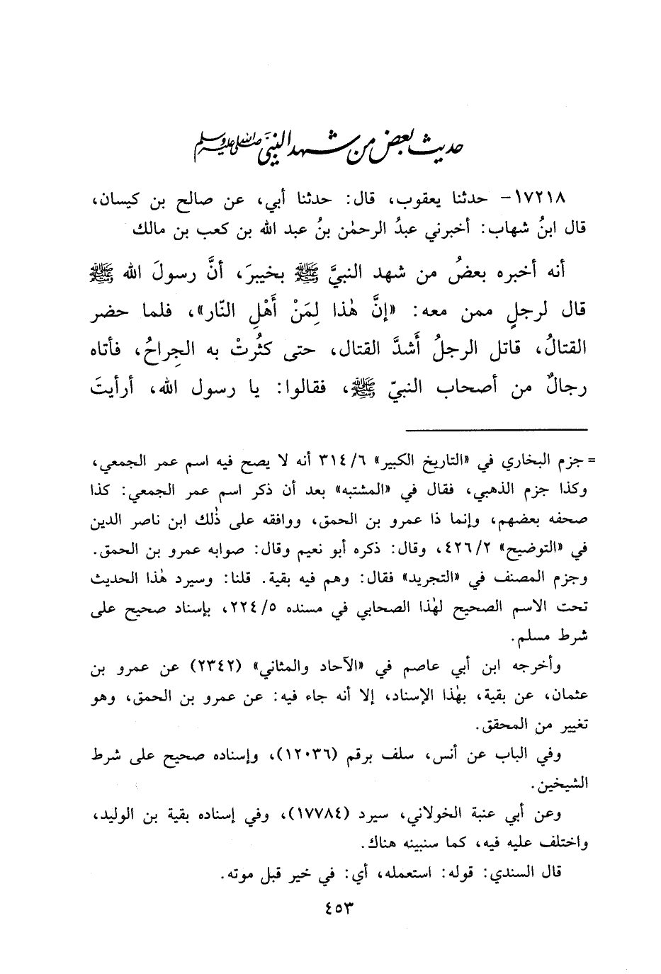 ١٧٢١٨ - حَدَّثَنَا يَعْقُوبُ، قَالَ: حَدَّثَنَا أَبِي، عَنْ صَالِحِ بْنِ كَيْسَانَ، قَالَ ابْنُ شِهَابٍ: أَخْبَرَنِي عَبْدُ الرَّحْمَنِ بْنُ عَبْدِ اللهِ بْنِ كَعْبِ بْنِ مَالِكٍ، أَنَّهُ أَخْبَرَهُ بَعْضُ مَنْ شَهِدَ النَّبِيَّ، صَلَّى اللهُ عَلَيْهِ وَسَلَّمَ بِخَيْبَرَ، أَنَّ رَسُولَ اللهِ صَلَّى اللهُ عَلَيْهِ وَسَلَّمَ قَالَ لِرَجُلٍ مِمَّنْ مَعَهُ: " إِنَّ هَذَا لَمِنْ أَهْلِ النَّارِ "، فَلَمَّا حَضَرَ الْقِتَالُ، قَاتَلَ الرَّجُلُ أَشَدَّ الْقِتَالِ، حَتَّى كَثُرَتْ بِهِ الْجِرَاحُ، فَأَتَاهُ رِجَالٌ مِنْ أَصْحَابِ النَّبِيِّ صَلَّى اللهُ عَلَيْهِ وَسَلَّمَ، فَقَالُوا: يَا رَسُولَ اللهِ، أَرَأَيْتَ