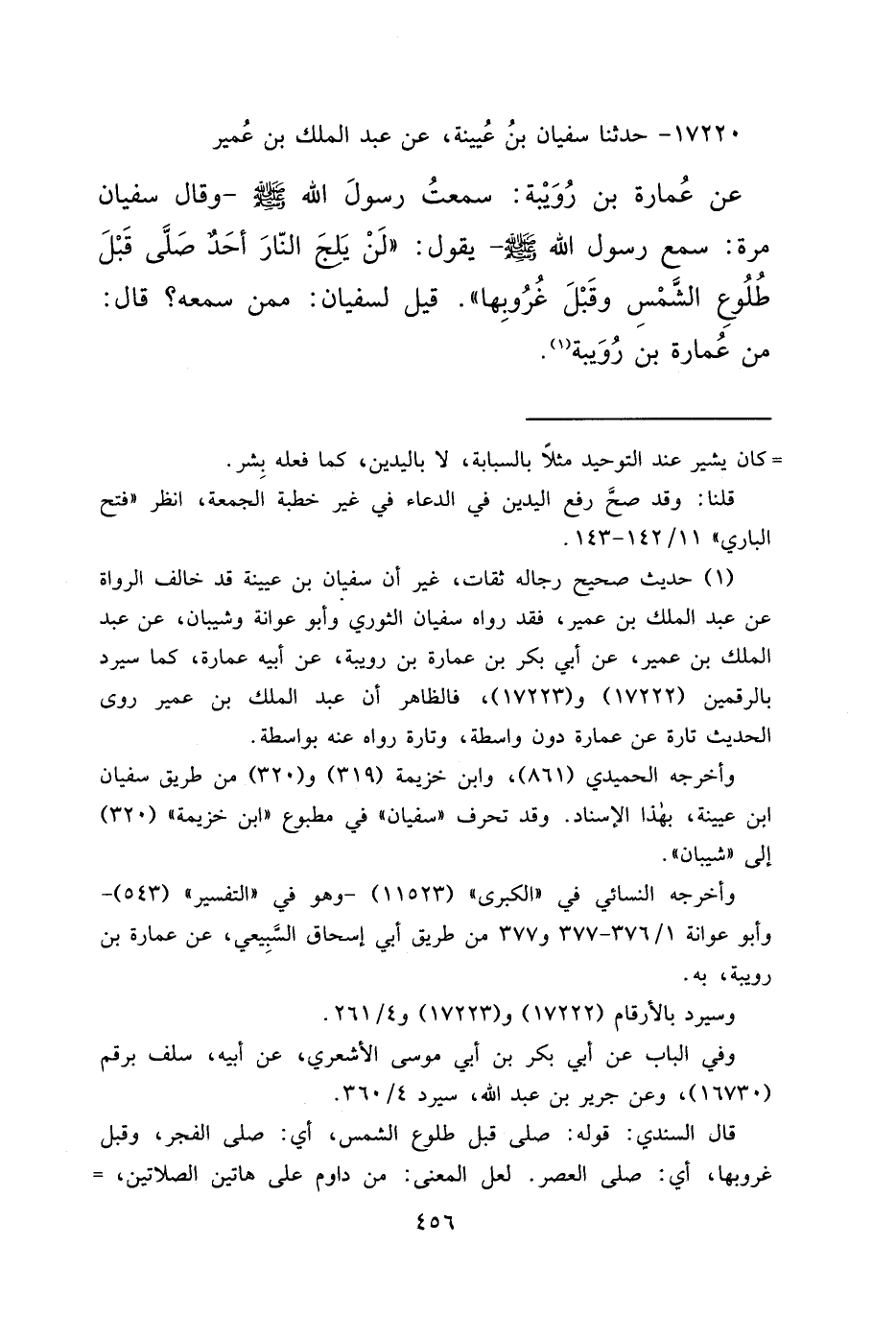 ١٧٢٢٠ - حَدَّثَنَا سُفْيَانُ بْنُ عُيَيْنَةَ، عَنْ عَبْدِ الْمَلِكِ بْنِ عُمَيْرٍ، عَنْ عِمَارَةَ بْنِ رُوَيْبَةَ: سَمِعْتُ رَسُولَ اللهِ صَلَّى اللهُ عَلَيْهِ وَسَلَّمَ - وَقَالَ سُفْيَانُ مَرَّةً: سَمِعَ رَسُولَ اللهِ صَلَّى اللهُ عَلَيْهِ وَسَلَّمَ - يَقُولُ: " لَنْ يَلِجَ النَّارَ أَحَدٌ صَلَّى قَبْلَ طُلُوعِ الشَّمْسِ وَقَبْلَ غُرُوبِهَا " قِيلَ لِسُفْيَانَ: مِمَّنْ سَمِعَهُ؟ قَالَ: مِنْ عُمَارَةَ بْنِ رُوَيْبَةَ (١)