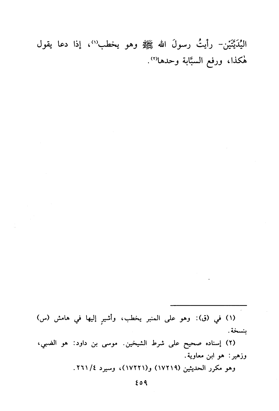 الْيُدِيَّتَيْنِ " رَأَيْتُ رَسُولَ اللهِ صَلَّى اللهُ عَلَيْهِ وَسَلَّمَ وَهُوَ يَخْطُبُ (١) ، إِذَا دَعَا يَقُولُ هَكَذَا، وَرَفَعَ السَّبَّابَةَ وَحْدَهَا " (٢)