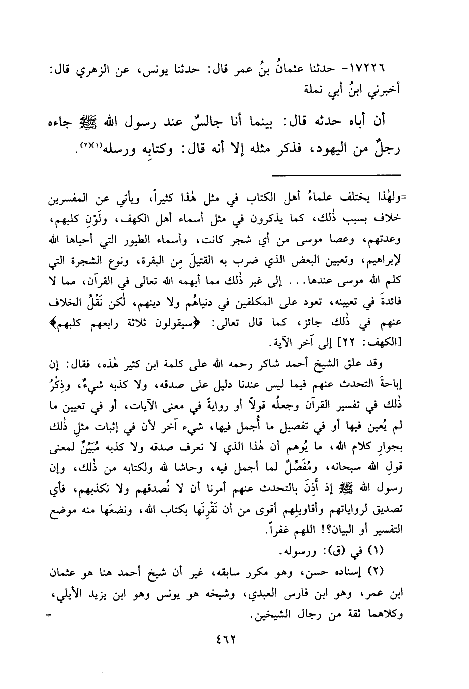 وقد علق الشيخ أحمد شاكر رحمه الله على كلمة ابن كثير هذه، فقال: إن إباحةَ التحدث عنهم فيما ليس عندنا دليل على صدقه، ولا كذبه شيءٌ وذِكْرُ ذلك في تفسير القرآن وجعلُه قولاً أو روايةً في معنى الآيات، أو في تعيين ما لم يُعين فيها أو في تفصيل ما أُجمل فيها، شيء آخر لأن في إثبات مثلِ ذلك بجوارِ كلام الله، ما يُوهم أن هذا الذي لا نعرف صدقه ولا كذبه مُبَيِّنٌ لمعنى قولِ الله سبحانه، ومُفَصَّل لما أجمل فيه، وحاشا لله ولكتابه من ذلك، وإن رسول الله صَلَّى اللهُ عَلَيْهِ وَسَلَّمَ إذ أَذِنَ بالتحدث عنهم أمرنا أن لا نُصدقهم ولا نكذبهم، فأي تصديق لرواياتهم وأقاويلِهم أقوى من أن نَقْرِنَها بكتاب الله، ونضعَها منه موضع التفسير أو البيان؟ ! اللهم غفراً.