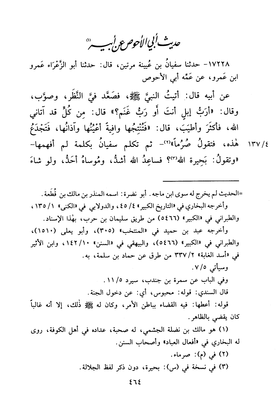 ١٧٢٢٨ - حَدَّثَنَا سُفْيَانُ بْنُ عُيَيْنَةَ، مَرَّتَيْنِ، قَالَ: حَدَّثَنَا أَبُو الزَّعْرَاءِ عَمْرُو بْنُ عَمْرٍو، عَنْ عَمِّهِ أَبِي الْأَحْوَصِ، عَنْ أَبِيهِ، قَالَ: أَتَيْتُ النَّبِيَّ صَلَّى اللهُ عَلَيْهِ وَسَلَّمَ، فَصَعَّدَ فِيَّ النَّظَرَ، وَصَوَّبَ، وَقَالَ: " أَرَبُّ إِبِلٍ أَنْتَ أَوْ رَبُّ غَنَمٍ؟ " قَالَ: مِنْ كُلٍّ قَدْ آتَانِي اللهُ، فَأَكْثَرَ وَأَطْيَبَ، قَالَ: " فَتُنْتِجُهَا وَافِيَةً أَعْيُنُهَا وَآذَانُهَا، فَتَجْدَعُ هَذِهِ، فَتَقُولُ صَرْمَا (٢) - ثُمَّ تَكَلَّمَ سُفْيَانُ بِكَلِمَةٍ لَمْ أَفْهَمْهَا - وَتَقُولُ: بَحِيرَةَ اللهِ (٣) ؟ فَسَاعِدُ اللهِ أَشَدُّ، وَمُوسَاهُ أَحَدُّ، وَلَوْ شَاءَ