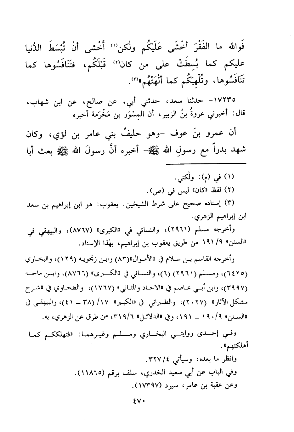 ١٧٢٣٥ - حَدَّثَنَا سَعْدٌ، حَدَّثَنِي أَبِي، عَنْ صَالِحٍ، عَنِ ابْنِ شِهَابٍ، قَالَ: أَخْبَرَنِي عُرْوَةُ بْنُ الزُّبَيْرِ، أَنَّ الْمِسْوَرَ بْنَ مَخْرَمَةَ، أَخْبَرَهُ، أَنَّ عَمْرَو بْنَ عَوْفٍ، وَهُوَ حَلِيفُ بَنِي عَامِرِ بْنِ لُؤَيٍّ، وَكَانَ شَهِدَ بَدْرًا مَعَ رَسُولِ اللهِ صَلَّى اللهُ عَلَيْهِ وَسَلَّمَ أَخْبَرَهُ أَنَّ رَسُولَ اللهِ صَلَّى اللهُ عَلَيْهِ وَسَلَّمَ بَعَثَ أَبَا