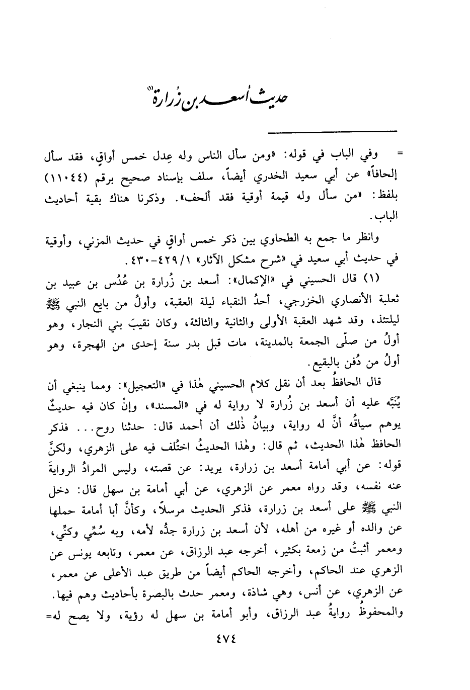قال الحافظُ بعد أن نقل كلام الحسيني هذا في "التعجيل": ومما ينبغي أن يُنَبَّه عليه أن أسعد بن زُرارة لا رواية له في "المسند"، وإنْ كان فيه حديثٌ يوهم سياقُه أن له رواية، وبيانُ ذلك أن أحمد قال: حدثنا روح ... فذكر الحافظ هذا الحديث، ثم قال: وهذا الحديثُ اختُلف فيه على الزهري، ولكنَّ