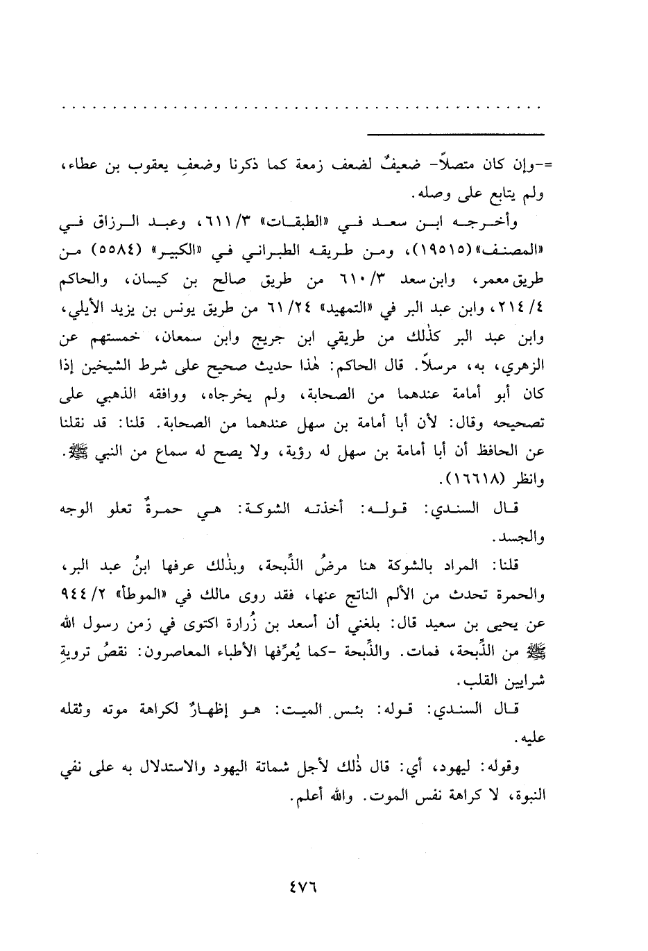 قلنا: المراد بالشوكة هنا مرضُ الذِّبحة، وبذلك عرفها ابن عبد البر، والحمرة تحدث من الألم الناتج عنها، فقد روى مالك في "الموطأ" ٢/٩٤٤ عن يحيى بن سعيد قال: بلغني أن أسعد بن زُرارة اكتوى في زمن رسول الله صَلَّى اللهُ عَلَيْهِ وَسَلَّمَ من الذِّبحة، فمات. والذِّبحة- كما يُعرِّفها الأطباء المعاصرون: نقصُ ترويةِ شرايين القلب.