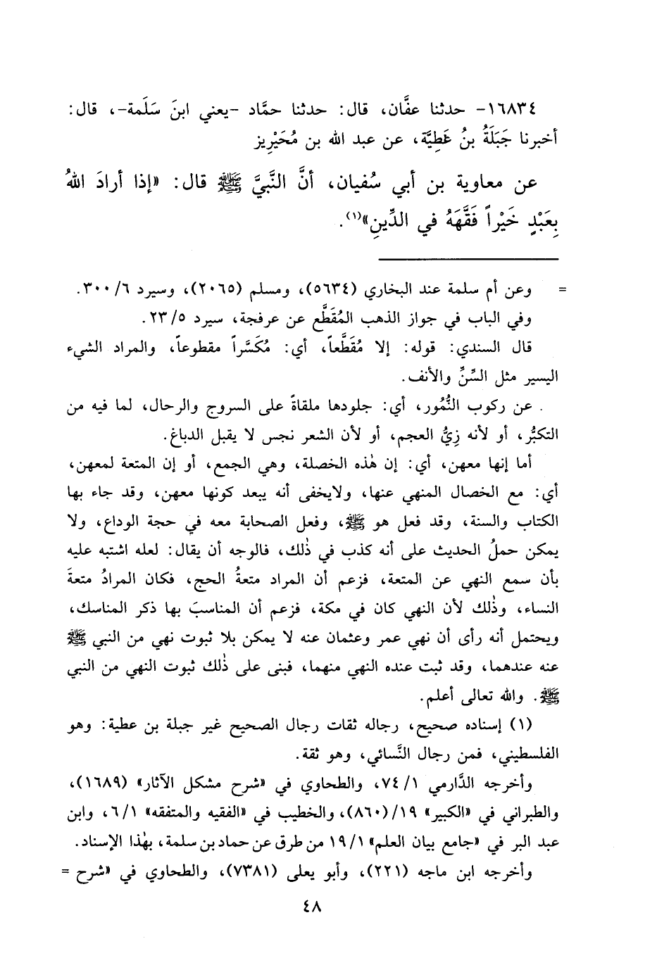 ١٦٨٣٤ - حَدَّثَنَا عَفَّانُ، قَالَ: حَدَّثَنَا حَمَّادٌ يَعْنِي ابْنَ سَلَمَةَ، قَالَ: أَخْبَرَنَا جَبَلَةُ بْنُ عَطِيَّةَ، عَنْ عَبْدِ اللهِ بْنِ مُحَيْرِيزٍ، عَنْ مُعَاوِيَةَ بْنِ أَبِي سُفْيَانَ، أَنَّ النَّبِيَّ صَلَّى اللهُ عَلَيْهِ وَسَلَّمَ قَالَ: " إِذَا أَرَادَ اللهُ بِعَبْدٍ خَيْرًا فَقَّهَهُ فِي الدِّينِ " (١)