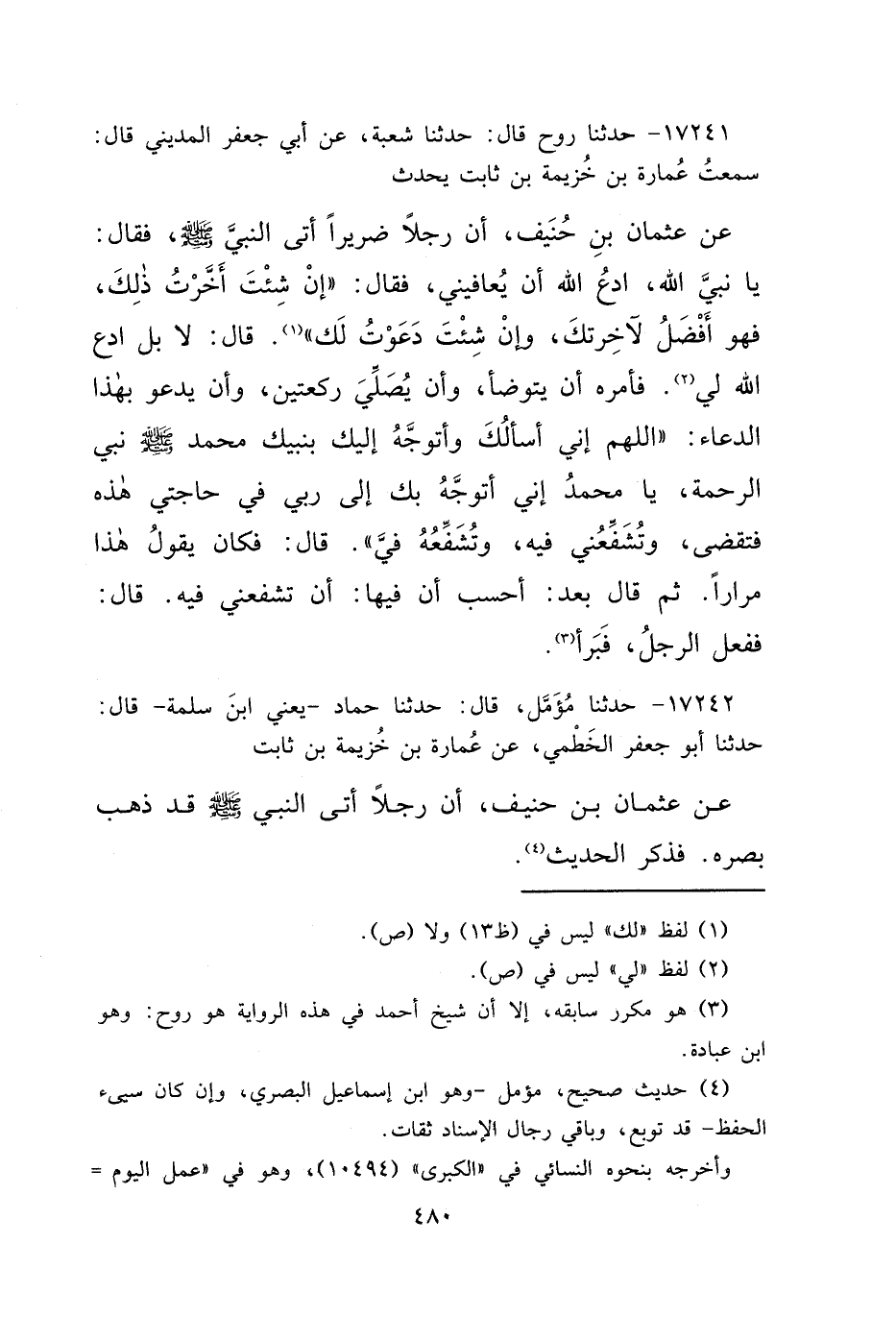 ١٧٢٤٢ - حَدَّثَنَا مُؤَمَّلٌ، قَالَ: حَدَّثَنَا حَمَّادٌ يَعْنِي ابْنَ سَلَمَةَ، قَالَ: حَدَّثَنَا أَبُو جَعْفَرٍ الْخَطْمِيُّ، عَنْ عُمَارَةَ بْنِ خُزَيْمَةَ بْنِ ثَابِتٍ، عَنْ عُثْمَانَ بْنِ حُنَيْفٍ، أَنَّ رَجُلًا أَتَى النَّبِيَّ صَلَّى اللهُ عَلَيْهِ وَسَلَّمَ قَدْ ذَهَبَ بَصَرُهُ، فَذَكَرَ الْحَدِيثَ (٤)