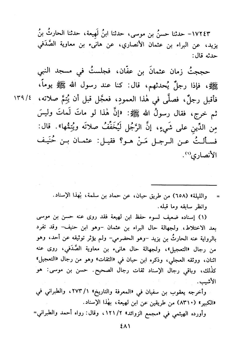 ١٧٢٤٣ - حَدَّثَنَا حَسَنُ بْنُ مُوسَى، حَدَّثَنَا ابْنُ لَهِيعَةَ، حَدَّثَنَا الْحَارِثُ بْنُ يَزِيدَ، عَنِ الْبَرَاءِ بْنِ عُثْمَانَ الْأَنْصَارِيِّ، عَنْ هَانِئِ بْنِ مُعَاوِيَةَ الصَّدَفِيِّ، حَدَّثَهُ قَالَ: حَجَجْتُ زَمَانَ عُثْمَانَ بْنِ عَفَّانَ، فَجَلَسْتُ فِي مَسْجِدِ النَّبِيِّ صَلَّى اللهُ عَلَيْهِ وَسَلَّمَ، فَإِذَا رَجُلٌ يُحَدِّثُهُمْ، قَالَ: كُنَّا عِنْدَ رَسُولِ اللهِ صَلَّى اللهُ عَلَيْهِ وَسَلَّمَ يَوْمًا، فَأَقْبَلَ رَجُلٌ، فَصَلَّى فِي هَذَا الْعَمُودِ، فَعَجَّلَ قَبْلَ أَنْ يُتِمَّ صَلَاتَهُ، ثُمَّ خَرَجَ، فَقَالَ رَسُولُ اللهِ صَلَّى اللهُ عَلَيْهِ وَسَلَّمَ: " إِنَّ هَذَا لَوْ مَاتَ لَمَاتَ وَلَيْسَ مِنَ الدِّينِ عَلَى شَيْءٍ، إِنَّ الرَّجُلَ لَيُخَفِّفُ صَلَاتَهُ وَيُتِمُّهَا ". قَالَ: فَسَأَلْتُ عَنِ الرَّجُلِ مَنْ هُوَ؟ فَقِيلَ: عُثْمَانُ بْنُ حُنَيْفٍ الْأَنْصَارِيُّ (١)