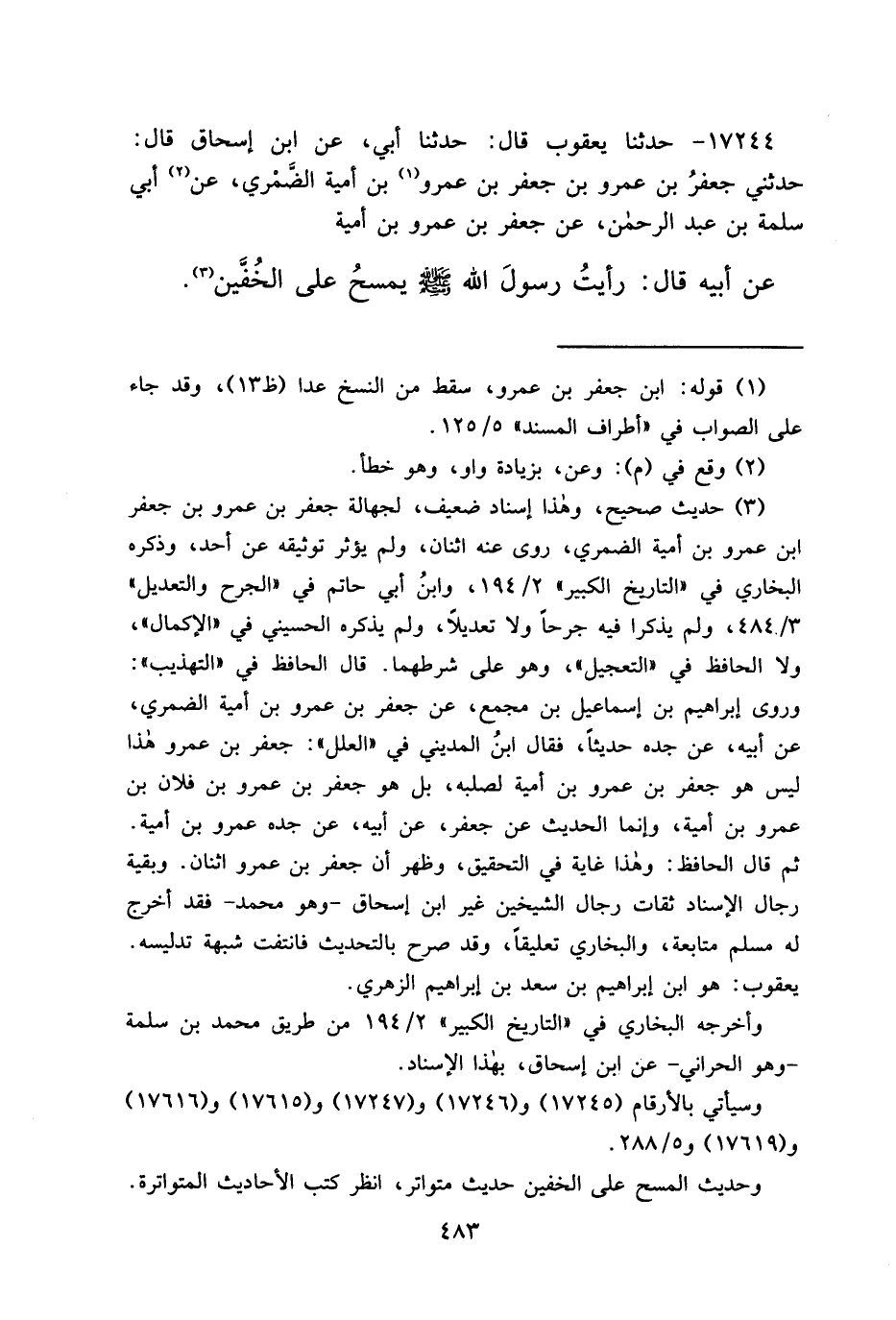 ١٧٢٤٤ - حَدَّثَنَا يَعْقُوبُ، قَالَ: حَدَّثَنَا أَبِي، عَنِ ابْنِ إِسْحَاقَ، قَالَ: حَدَّثَنِي جَعْفَرُ بْنُ عَمْرِو بْنِ جَعْفَرَ بْنِ عَمْرِو (١) بْنِ أُمَيَّةَ الضَّمْرِيُّ، عَنْ أَبِي (٢) سَلَمَةَ بْنِ عَبْدِ الرَّحْمَنِ، عَنْ جَعْفَرِ بْنِ عَمْرِو بْنِ أُمَيَّةَ، عَنْ أَبِيهِ، قَالَ: " رَأَيْتُ رَسُولَ اللهِ صَلَّى اللهُ عَلَيْهِ وَسَلَّمَ يَمْسَحُ عَلَى الْخُفَّيْنِ " (٣)
