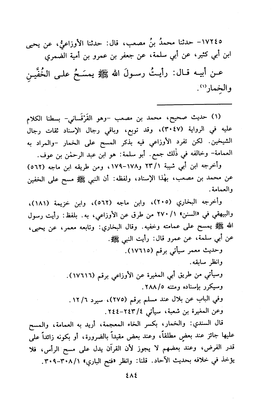 (١) حديث صحيح، محمد بن مصعب- وهو القَرْقَساني- بسطنا الكلام عليه في الرواية (٣٠٤٧) ، وقد توبع، وباقي رجال الإسناد ثقات رجال الشيخين. لكن تفرد الأوزاعي فيه بذكر المسح على الخمار- والمراد به العمامة- وخالفه في ذلك جمع. أبو سلمة: هو ابن عبد الرحمن بن عوف.