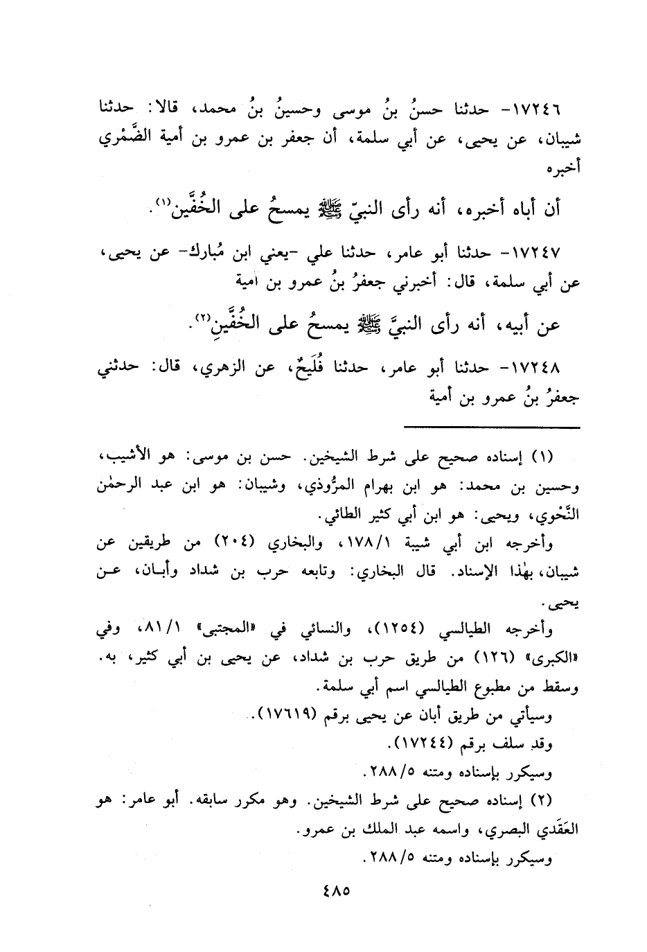 ١٧٢٤٦ - حَدَّثَنَا حَسَنُ بْنُ مُوسَى، وَحُسَيْنُ بْنُ مُحَمَّدٍ، قَالَا: حَدَّثَنَا شَيْبَانُ، عَنْ يَحْيَى، عَنْ أَبِي سَلَمَةَ، أَنَّ جَعْفَرَ بْنَ عَمْرِو بْنِ أُمَيَّةَ الضَّمْرِيَّ، أَخْبَرَهُ، أَنَّ أَبَاهُ، أَخْبَرَهُ، أَنَّهُ " رَأَى النَّبِيَّ صَلَّى اللهُ عَلَيْهِ وَسَلَّمَ يَمْسَحُ عَلَى الْخُفَّيْنِ " (١)