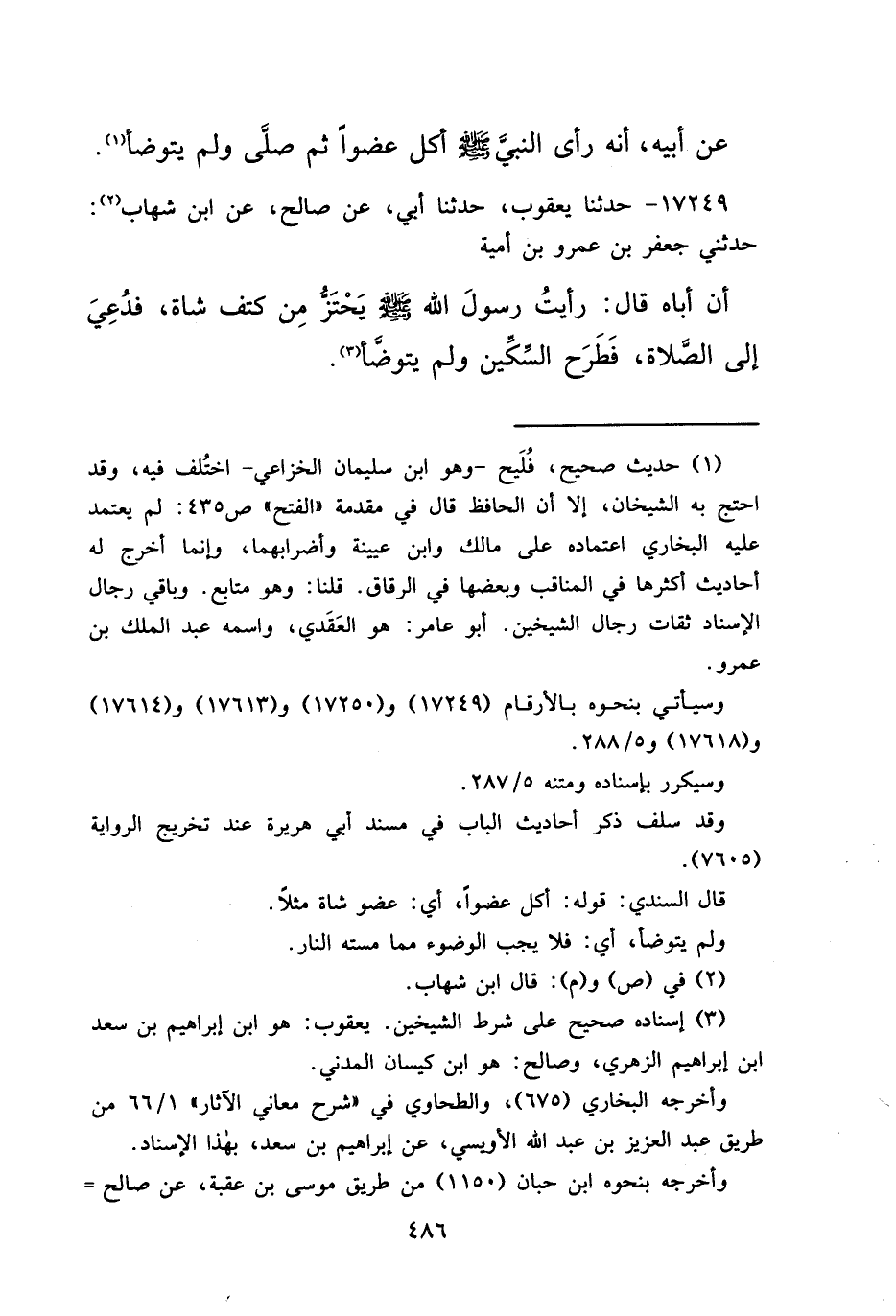 ١٧٢٤٩ - حَدَّثَنَا يَعْقُوبُ، حَدَّثَنَا أَبِي، عَنْ صَالِحٍ، قَالَ ابْنُ شِهَابٍ (٢) : حَدَّثَنِي جَعْفَرُ بْنُ عَمْرِو بْنِ أُمَيَّةَ، أَنَّ أَبَاهُ، قَالَ: " رَأَيْتُ رَسُولَ اللهِ صَلَّى اللهُ عَلَيْهِ وَسَلَّمَ يَحْتَزُّ مِنْ كَتِفِ شَاةٍ، فَدُعِيَ إِلَى الصَّلَاةِ، فَطَرَحَ السِّكِّينَ وَلَمْ يَتَوَضَّأْ " (٣)