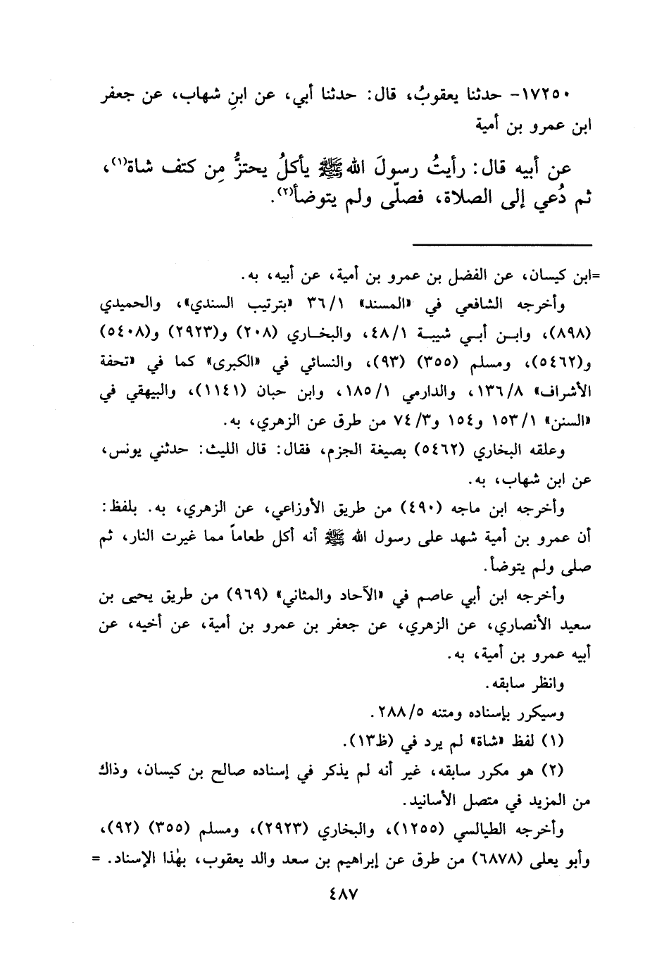 ١٧٢٥٠ - حَدَّثَنَا يَعْقُوبُ، قَالَ: حَدَّثَنَا أَبِي، عَنِ ابْنِ شِهَابٍ، عَنْ جَعْفَرِ بْنِ عَمْرِو بْنِ أُمَيَّةَ، عَنْ أَبِيهِ، قَالَ: " رَأَيْتُ رَسُولَ اللهِ صَلَّى اللهُ عَلَيْهِ وَسَلَّمَ يَأْكُلُ يَحْتَزُّ مِنْ كَتِفِ شَاةٍ (١) ، ثُمَّ دُعِيَ إِلَى الصَّلَاةِ، فَصَلَّى وَلَمْ يَتَوَضَّأْ " (٢)