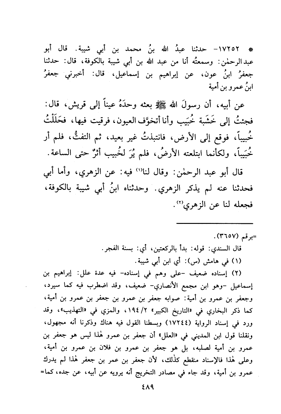* ١٧٢٥٢ - حَدَّثَنَا عَبْدُ اللهِ بْنُ مُحَمَّدِ بْنِ أَبِي شَيْبَةَ، قَالَ أَبُو عَبْدِ الرَّحْمَنِ: وَسَمِعْتُهُ أَنَا مِنْ عَبْدِ اللهِ بْنِ أَبِي شَيْبَةَ، بِالْكُوفَةِ، قَالَ: حَدَّثَنَا جَعْفَرُ بْنُ عَوْنٍ، عَنْ إِبْرَاهِيمَ بْنِ إِسْمَاعِيلَ، قَالَ: أَخْبَرَنِي جَعْفَرُ بْنُ عَمْرِو بْنِ أُمَيَّةَ، عَنْ أَبِيهِ، " أَنَّ رَسُولَ اللهِ صَلَّى اللهُ عَلَيْهِ وَسَلَّمَ بَعَثَهُ وَحْدَهُ عَيْنًا إِلَى قُرَيْشٍ "، قَالَ: جِئْتُ إِلَى خَشَبَةِ خُبَيْبٍ وَأَنَا أَتَخَوَّفُ الْعُيُونَ، فَرَقِيتُ فِيهَا، فَحَلَلْتُ خُبَيْبًا، فَوَقَعَ إِلَى الْأَرْضِ، فَانْتَبَذْتُ غَيْرَ بَعِيدٍ، ثُمَّ الْتَفَتُّ، فَلَمْ أَرَ خُبَيْبًا، وَلَكَأَنَّمَا ابْتَلَعَتْهُ الْأَرْضُ، فَلَمْ يُرَ لِخُبَيْبٍ أَثَرٌ حَتَّى السَّاعَةِ وقَالَ أَبُو عَبْدِ الرَّحْمَنِ: " وَقَالَ لَنَا (١) فِيهِ: عَنِ الزُّهْرِيِّ، وَأَمَّا أَبِي فَحَدَّثَنَا عَنْهُ لَمْ يَذْكُرِ الزُّهْرِيَّ. وَحَدَّثَنَاهُ ابْنُ أَبِي شَيْبَةَ بِالْكُوفَةِ، فَجَعَلَهُ لَنَا عَنِ الزُّهْرِيِّ " (٢)