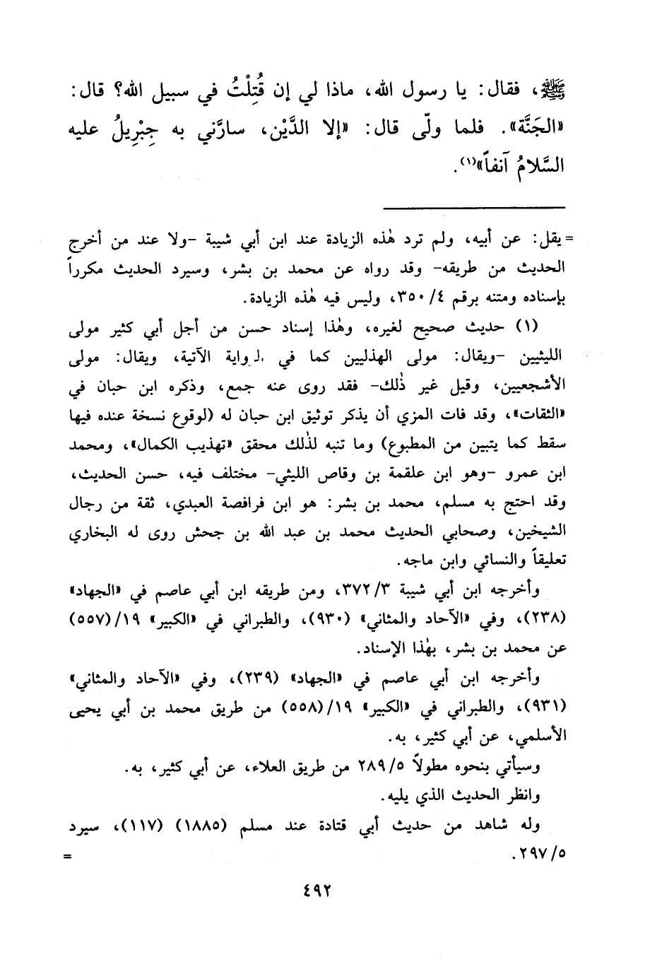 فَقَالَ: يَا رَسُولَ اللهِ، مَاذَا لِي إِنْ قُتِلْتُ فِي سَبِيلِ اللهِ؟ قَالَ: " الْجَنَّةُ " فَلَمَّا وَلَّى قَالَ: " إِلَّا الدَّيْنُ، سَارَّنِي بِهِ جِبْرِيلُ عَلَيْهِ السَّلَامُ آنِفًا " (١)