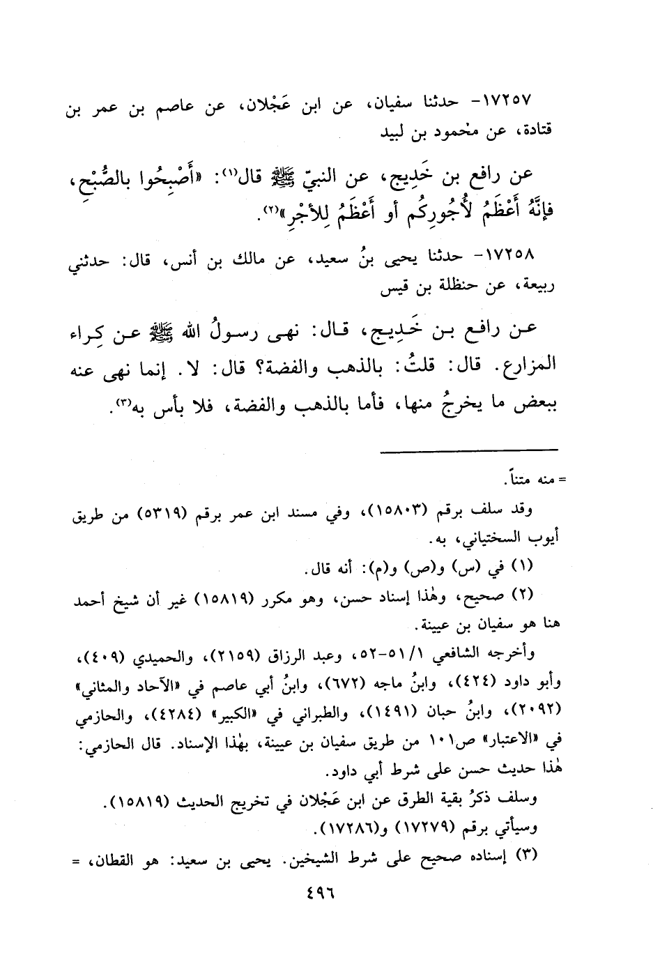 ١٧٢٥٧ - حَدَّثَنَا سُفْيَانُ، عَنِ ابْنِ عَجْلَانَ، عَنْ عَاصِمِ بْنِ عُمَرَ بْنِ قَتَادَةَ، عَنْ مَحْمُودِ بْنِ لَبِيدٍ، عَنْ رَافِعِ بْنِ خَدِيجٍ، عَنِ النَّبِيِّ صَلَّى اللهُ عَلَيْهِ وَسَلَّمَ، قَالَ (١) : " أَصْبِحُوا بِالصُّبْحِ، فَإِنَّهُ أَعْظَمُ لِأُجُورِكُمْ أَوْ أَعْظَمُ لِلْأَجْرِ " (٢)