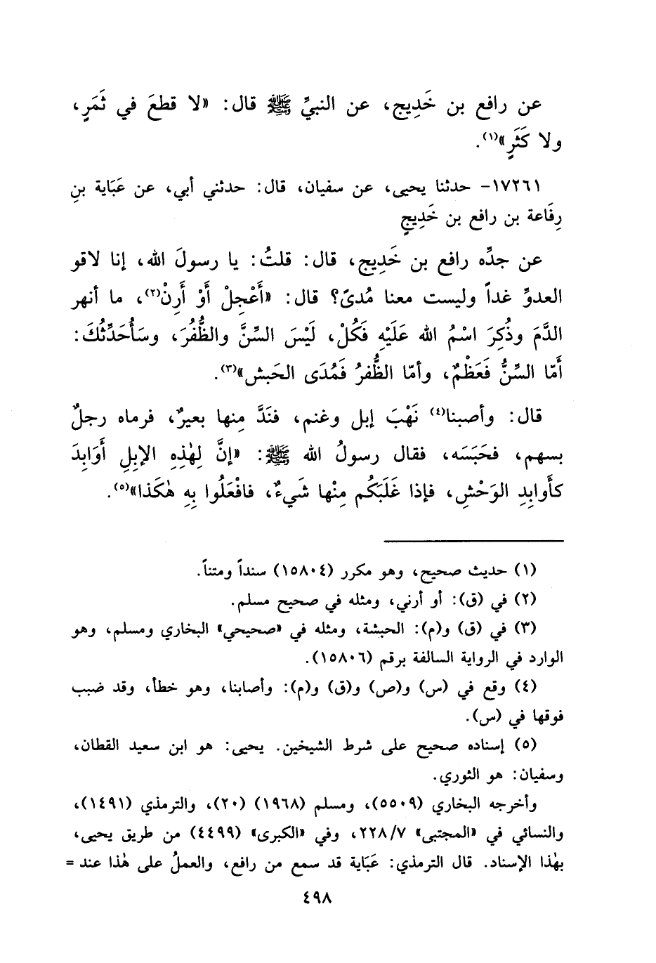 ١٧٢٦١ - حَدَّثَنَا يَحْيَى، عَنْ سُفْيَانَ، قَالَ: حَدَّثَنِي أَبِي، عَنْ عَبَايَةَ بْنِ رِفَاعَةَ بْنِ رَافِعِ بْنِ خَدِيجٍ، عَنْ جَدِّهِ رَافِعِ بْنِ خَدِيجٍ، قَالَ: قُلْتُ: يَا رَسُولَ اللهِ، إِنَّا لَاقُو الْعَدُوِّ غَدًا وَلَيْسَتْ مَعَنَا مُدًى؟ قَالَ: " أَعْجِلْ أَوْ أَرِنْ (٢) ، مَا أَنْهَرَ الدَّمَ وَذُكِرَ اسْمُ اللهِ عَلَيْهِ فَكُلْ، لَيْسَ السِّنَّ وَالظُّفُرَ، وَسَأُحَدِّثُكَ: أَمَّا السِّنُّ فَعَظْمٌ، وَأَمَّا الظُّفُرُ فَمُدَى الْحَبَشِ " (٣) . قَالَ: وَأَصْبَنَا (٤) نَهْبَ إِبِلٍ وَغَنَمٍ، فَنَدَّ مِنْهَا بَعِيرٌ، فَرَمَاهُ رَجُلٌ بِسَهْمٍ، فَحَبَسَهُ، فَقَالَ رَسُولُ اللهِ صَلَّى اللهُ عَلَيْهِ وَسَلَّمَ: " إِنَّ لَهَذِهِ الْإِبِلِ أَوَابِدَ كَأَوَابِدِ الْوَحْشِ، فَإِذَا غَلَبَكُمْ مِنْهَا شَيْءٌ، فَافْعَلُوا بِهِ هَكَذَا " (٥)