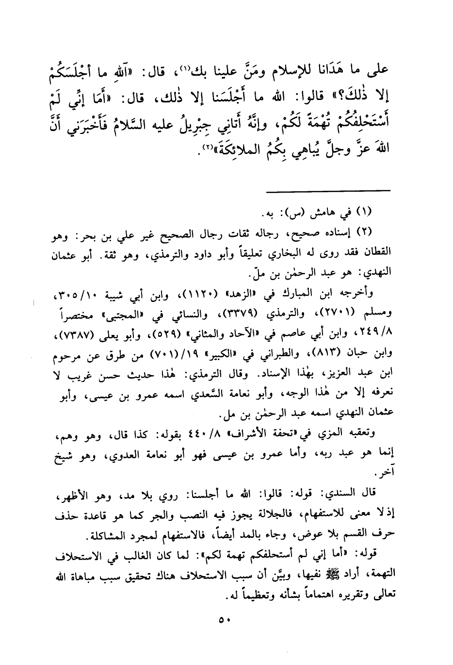 عَلَى مَا هَدَانَا لِلْإِسْلَامِ وَمَنَّ عَلَيْنَا بِكَ (١) ، قَالَ: " آللَّهِ مَا أَجْلَسَكُمْ إِلَّا ذَلِكَ؟ " قَالُوا: آللَّهِ مَا أَجْلَسَنَا إِلَّا ذَلِكَ، قَالَ: " أَمَا إِنِّي لَمْ أَسْتَحْلِفْكُمْ تُهْمَةً لَكُمْ، وَإِنَّهُ أَتَانِي جِبْرِيلُ عَلَيْهِ السَّلَامُ فَأَخْبَرَنِي أَنَّ اللهَ عَزَّ وَجَلَّ يُبَاهِي بِكُمُ الْمَلَائِكَةَ " (٢)