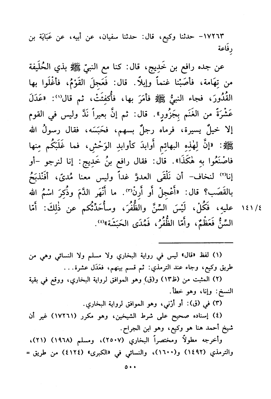 ١٧٢٦٣ - حَدَّثَنَا وَكِيعٌ، قَالَ: حَدَّثَنَا سُفْيَانُ، عَنْ أَبِيهِ، عَنْ عَبَايَةَ بْنِ رِفَاعَةَ، عَنْ جَدِّهِ رَافِعِ بْنِ خَدِيجٍ، قَالَ: كُنَّا مَعَ النَّبِيِّ صَلَّى اللهُ عَلَيْهِ وَسَلَّمَ بِذِي الْحُلَيْفَةِ مِنْ تِهَامَةَ، فَأَصَبْنَا غَنَمًا وَإِبِلًا. قَالَ: فَعَجَّلَ الْقَوْمُ، فَأَغْلَوْا بِهَا الْقُدُورَ، فَجَاءَ النَّبِيُّ صَلَّى اللهُ عَلَيْهِ وَسَلَّمَ فَأَمَرَ بِهَا، فَأُكْفِئَتْ، ثُمَّ قَالَ (١) : " عَدْلُ عَشْرَةٍ مِنَ الْغَنَمِ بِجَزُورٍ ". قَالَ: ثُمَّ إِنَّ بَعِيرًا نَدَّ وَلَيْسَ فِي الْقَوْمِ إِلَّا خَيْلٌ يَسِيرَةٌ، فَرَمَاهُ رَجُلٌ بِسَهْمٍ، فَحَبَسَهُ، فَقَالَ رَسُولُ اللهِ صَلَّى اللهُ عَلَيْهِ وَسَلَّمَ: " إِنَّ لِهَذِهِ الْبَهَائِمِ أَوَابِدَ كَأَوَابِدِ الْوَحْشِ، فَمَا غَلَبَكُمْ مِنْهَا فَاصْنَعُوا بِهِ هَكَذَا ". قَالَ: فَقَالَ رَافِعُ بْنُ خَدِيجٍ: إِنَّا لَنَرْجُو أوْ إِنَّا (٢) لَنَخَافُ أَنْ نَلْقَى الْعَدُوَّ غَدًا وَلَيْسَ مَعَنَا مُدًى، أَفَنَذْبَحُ بِالْقَصَبِ؟ قَالَ: " أَعْجِلْ أَوْ أَرِنْ (٣) ، مَا أَنْهَرَ الدَّمَ وَذُكِرَ اسْمُ اللهِ عَلَيْهِ، فَكُلْ، لَيْسَ السِّنَّ وَالظُّفُرَ، وَسَأُحَدِّثُكُمْ عَنْ ذَلِكَ: أَمَّا السِّنُّ فَعَظْمٌ، وَأَمَّا الظُّفُرُ، فَمُدَى الْحَبَشَةِ " (٤)