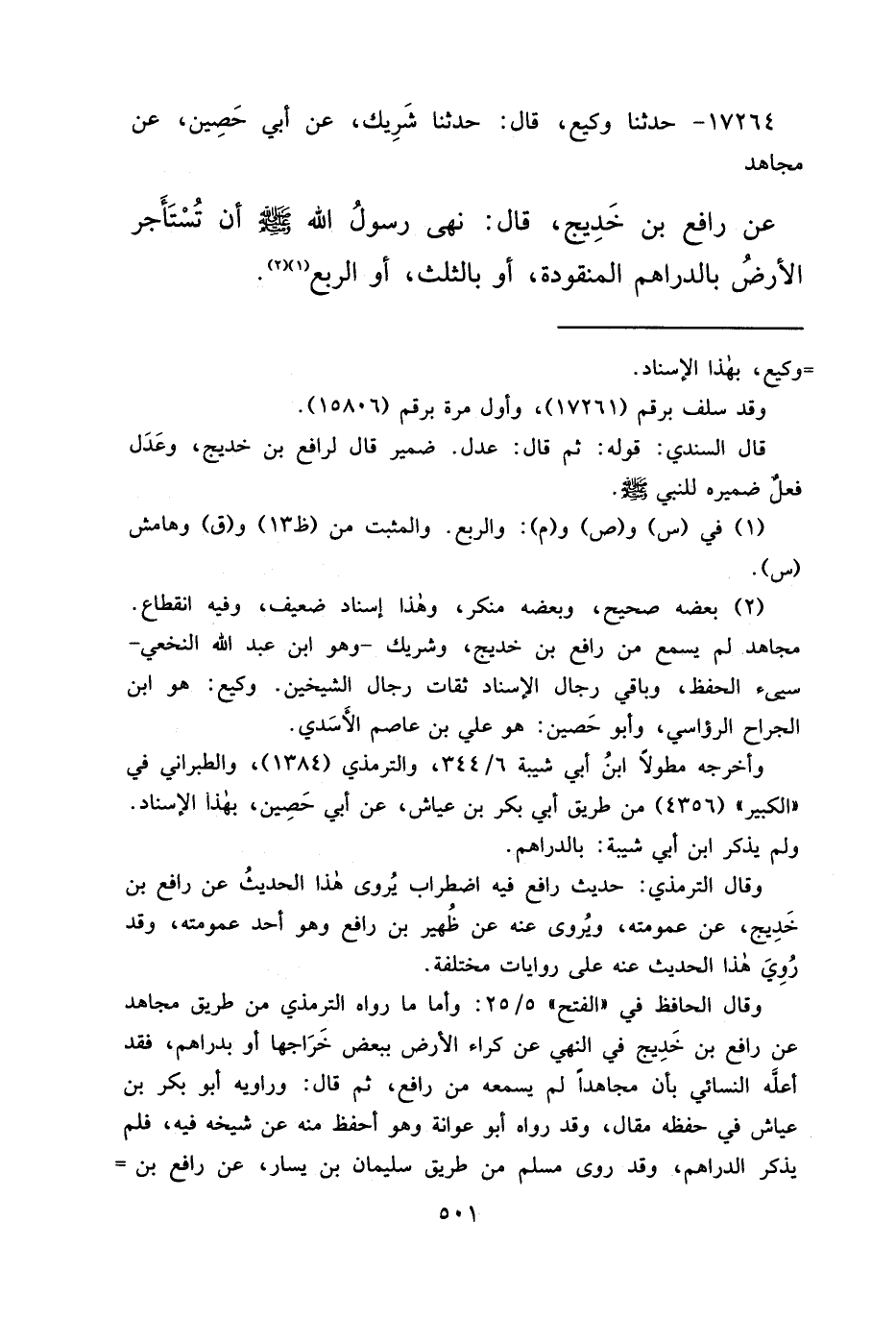 ١٧٢٦٤ - حَدَّثَنَا وَكِيعٌ، قَالَ: حَدَّثَنَا شَرِيكٌ، عَنْ أَبِي حَصِينٍ، عَنْ مُجَاهِدٍ، عَنْ رَافِعِ بْنِ خَدِيجٍ، قَالَ: " نَهَى رَسُولُ اللهِ صَلَّى اللهُ عَلَيْهِ وَسَلَّمَ أَنْ تُسْتَأْجَرَ الْأَرْضُ بِالدَّرَاهِمِ الْمَنْقُودَةِ، أَوْ بِالثُّلُثِ أوِ الرُّبُعِ (١) " (٢)