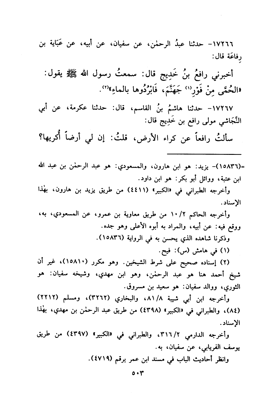 ١٧٢٦٦ - حَدَّثَنَا عَبْدُ الرَّحْمَنِ، عَنْ سُفْيَانَ، عَنْ أَبِيهِ، عَنْ عَبَايَةَ بْنِ رِفَاعَةَ، قَالَ: أَخْبَرَنِي رَافِعُ بْنُ خَدِيجٍ، قَالَ: سَمِعْتُ رَسُولَ اللهِ صَلَّى اللهُ عَلَيْهِ وَسَلَّمَ يَقُولُ: " الْحُمَّى مِنْ فَوْرِ (١) جَهَنَّمَ، فَأَبْرِدُوهَا بِالْمَاءِ " (٢)