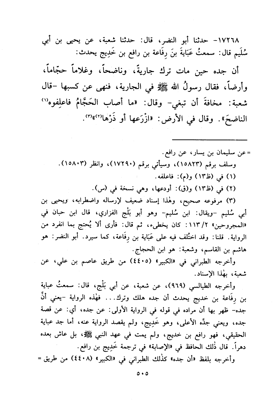 ١٧٢٦٨ - حَدَّثَنَا أَبُو النَّضْرِ، قَالَ: حَدَّثَنَا شُعْبَةُ، عَنْ يَحْيَى بْنِ أَبِي سُلَيْمٍ، قَالَ: سَمِعْتُ عَبَايَةَ بْنَ رِفَاعَةَ بْنِ رَافِعِ بْنِ خَدِيجٍ، يُحَدِّثُ: أَنَّ جَدَّهُ، حِينَ مَاتَ تَرَكَ جَارِيَةً، وَنَاضِحًا، وَغُلَامًا حَجَّامًا، وَأَرْضًا، فَقَالَ رَسُولُ اللهِ صَلَّى اللهُ عَلَيْهِ وَسَلَّمَ فِي الْجَارِيَةِ، فَنَهَى عَنْ كَسْبِهَا - قَالَ شُعْبَةُ: مَخَافَةَ أَنْ تَبْغِيَ - وَقَالَ: " مَا أَصَابَ الْحَجَّامُ فَاعْلِفُوهُ (١) النَّاضِحَ ". وَقَالَ فِي الْأَرْضِ: " ازْرَعْهَا أَوْ ذَرْهَا (٢) " (٣)