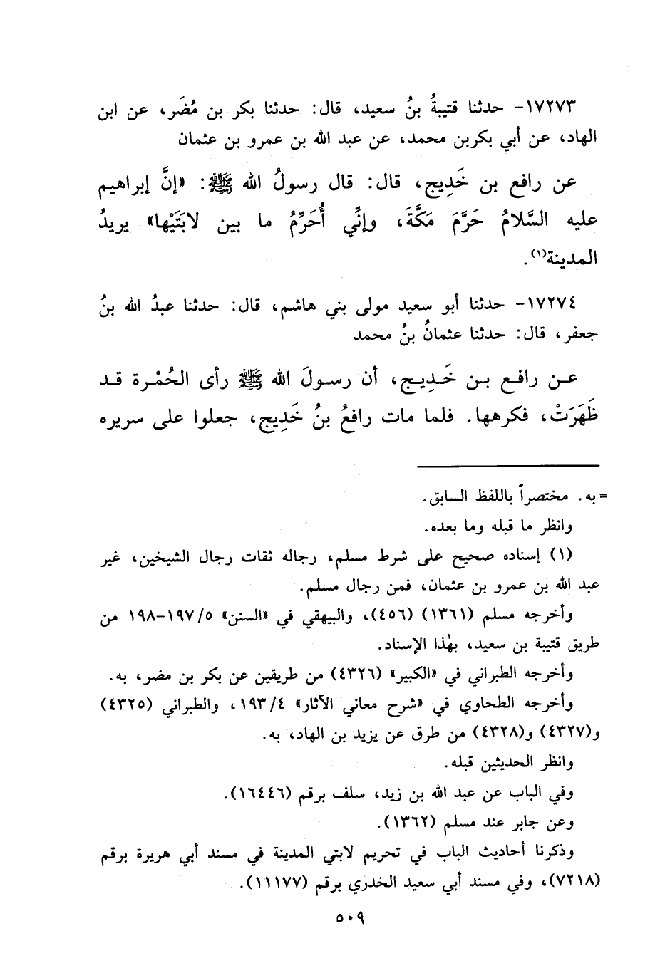 ١٧٢٧٣ - حَدَّثَنَا قُتَيْبَةُ بْنُ سَعِيدٍ، قَالَ: حَدَّثَنَا بَكْرُ بْنُ مُضَرَ، عَنْ ابْنِ الْهَادِ، عَنْ أَبِي بَكْرِ بْنِ مُحَمَّدٍ، عَنْ عَبْدِ اللهِ بْنِ عَمْرِو بْنِ عُثْمَانَ، عَنْ رَافِعِ بْنِ خَدِيجٍ، قَالَ: قَالَ رَسُولُ اللهِ صَلَّى اللهُ عَلَيْهِ وَسَلَّمَ: " إِنَّ إِبْرَاهِيمَ عَلَيْهِ السَّلَامُ حَرَّمَ مَكَّةَ، وَإِنِّي أُحَرِّمُ مَا بَيْنَ لَابَتَيْهَا " يُرِيدُ الْمَدِينَةَ (١)