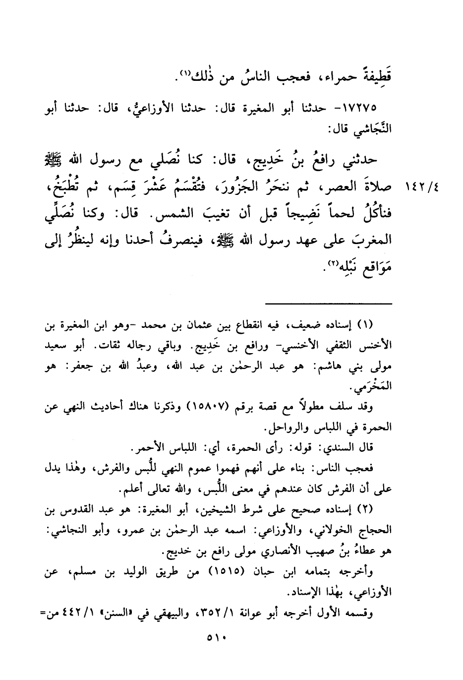 ١٧٢٧٥ - حَدَّثَنَا أَبُو الْمُغِيرَةِ، قَالَ: حَدَّثَنَا الْأَوْزَاعِيُّ، قَالَ: حَدَّثَنَا أَبُو النَّجَاشِيِّ، قَالَ: حَدَّثَنِي رَافِعُ بْنُ خَدِيجٍ، قَالَ: " كُنَّا نُصَلِّي مَعَ رَسُولِ اللهِ صَلَّى اللهُ عَلَيْهِ وَسَلَّمَ صَلَاةَ الْعَصْرِ، ثُمَّ نَنْحَرُ الْجَزُورَ، فَتُقْسَمُ عَشَرَ قَسْمٍ، ثُمَّ تُطْبَخُ، فَنَأْكُلُ لَحْمًا نَضِيجًا قَبْلَ أَنْ تَغِيبَ الشَّمْسُ "
