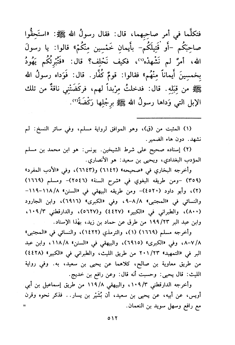 فَتَكَلَّمَا فِي أَمْرِ صَاحِبِهِمَا، قَالَ: فَقَالَ رَسُولُ اللهِ صَلَّى اللهُ عَلَيْهِ وَسَلَّمَ: " اسْتَحِقُّوا صَاحِبَكُمْ أَوْ قَتِيلَكُمْ بِأَيْمَانِ خَمْسِينَ مِنْكُمْ " قَالُوا: يَا رَسُولَ اللهِ، أَمْرٌ لَمْ نَشْهَدْهُ (١) ، فَكَيْفَ نَحْلِفُ؟ قَالَ: " فَتُبْرِئُكُمْ يَهُودُ بِخَمْسِينَ أَيْمَانًا مِنْهُمْ " فَقَالُوا: قَوْمٌ كُفَّارٌ. قَالَ: فَوَدَاهُ رَسُولُ اللهِ صَلَّى اللهُ عَلَيْهِ وَسَلَّمَ مِنْ قِبَلِهِ قَالَ: " فَدَخَلْتُ مِرْبَدًا لَهُمْ، فَرَكَضَتْنِي نَاقَةٌ مِنْ تِلْكَ الْإِبِلِ الَّتِي وَدَاهَا رَسُولُ اللهِ صَلَّى اللهُ عَلَيْهِ وَسَلَّمَ بِرِجْلِهَا رَكْضَةً " (٢)