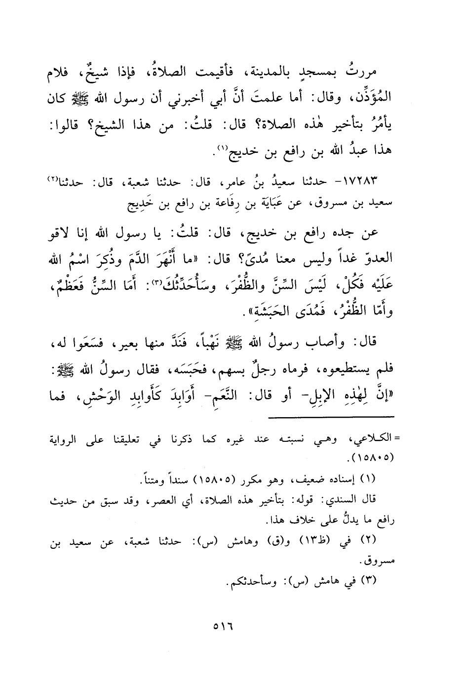 قال السندي: قوله: بتأخير هذه الصلاة، أي العصر، وقد سبق من حديث رافع ما يدلُّ على خلاف هذا.