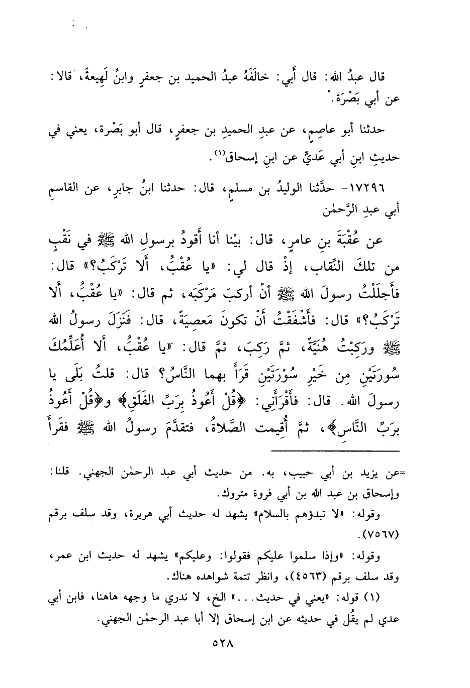 ١٧٢٩٦ - حَدَّثَنَا الْوَلِيدُ بْنُ مُسْلِمٍ، قَالَ: حَدَّثَنَا ابْنُ جَابِرٍ، عَنْ الْقَاسِمِ أَبِي عَبْدِ الرَّحْمَنِ، عَنْ عُقْبَةَ بْنِ عَامِرٍ، قَالَ: بَيْنَا أَنَا أَقُودُ بِرَسُولِ اللهِ صَلَّى اللهُ عَلَيْهِ وَسَلَّمَ فِي نَقَبٍ مِنْ تِلْكَ النِّقَابِ، إِذْ قَالَ لِي: " يَا عُقْبَ، أَلَا تَرْكَبُ؟ " قَالَ: فَأَجْلَلْتُ رَسُولَ اللهِ صَلَّى اللهُ عَلَيْهِ وَسَلَّمَ أَنْ أَرْكَبَ مَرْكَبَهُ، ثُمَّ قَالَ: " يَا عُقْبُ، أَلَا تَرْكَبُ؟ " قَالَ: فَأَشْفَقْتُ أَنْ تَكُونَ مَعْصِيَةً، قَالَ: فَنَزَلَ رَسُولُ اللهِ صَلَّى اللهُ عَلَيْهِ وَسَلَّمَ وَرَكِبْتُ هُنَيَّةً، ثُمَّ رَكِبَ، ثُمَّ قَالَ: " يَا عُقْبُ، أَلَا أُعَلِّمُكَ سُورَتَيْنِ مِنْ خَيْرِ سُورَتَيْنِ قَرَأَ بِهِمَا النَّاسُ؟ " قَالَ: قُلْتُ: بَلَى يَا رَسُولَ اللهِ. قَالَ: فَأَقْرَأَنِي: قُلْ أَعُوذُ بِرَبِّ الْفَلَقِ وَقُلْ أَعُوذُ بِرَبِّ النَّاسِ، ثُمَّ أُقِيمَتِ الصَّلَاةُ، فَتَقَدَّمَ رَسُولُ اللهِ صَلَّى اللهُ عَلَيْهِ وَسَلَّمَ فَقَرَأَ