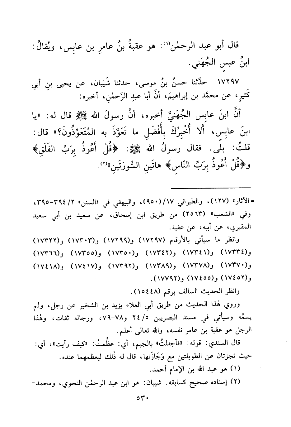 ١٧٢٩٧ - حَدَّثَنَا حَسَنُ بْنُ مُوسَى، حَدَّثَنَا شَيْبَانُ، عَنْ يَحْيَى بْنِ أَبِي كَثِيرٍ، عَنْ مُحَمَّدِ بْنِ إِبْرَاهِيمَ، أَنَّ أَبَا عَبْدِ اللهِ، أَخْبَرَهُ، أَنَّ ابْنَ عَابِسٍ الْجُهَنِيَّ، أَخْبَرَهُ، أَنَّ رَسُولَ اللهِ صَلَّى اللهُ عَلَيْهِ وَسَلَّمَ قَالَ لَهُ: " يَا ابْنَ عَابِسٍ، أَلَا أُخْبِرُكَ بِأَفْضَلِ مَا تَعَوَّذَ بِهِ الْمُتَعَوِّذُونَ؟ " قَالَ: قُلْتُ: بَلَى. فَقَالَ رَسُولُ اللهِ صَلَّى اللهُ عَلَيْهِ وَسَلَّمَ: " قُلْ أَعُوذُ بِرَبِّ الْفَلَقِ وَقُلْ أَعُوذُ بِرَبِّ النَّاسِ هَاتَيْنِ السُّورَتَيْنِ " (٢)