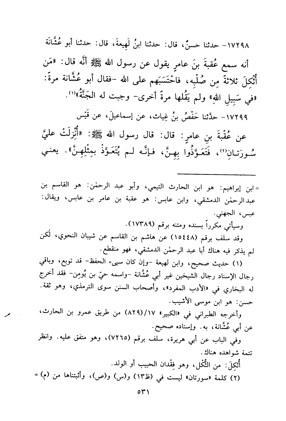 ١٧٢٩٨ - حَدَّثَنَا حَسَنٌ، قَالَ: حَدَّثَنَا ابْنُ لَهِيعَةَ، قَالَ: حَدَّثَنَا أَبُو عُشَّانَةَ، أَنَّهُ سَمِعَ عُقْبَةَ بْنَ عَامِرٍ، يَقُولُ: عَنْ رَسُولِ اللهِ صَلَّى اللهُ عَلَيْهِ وَسَلَّمَ أَنَّهُ قَالَ: " مَنْ أَثْكَلَ ثَلَاثَةً مِنْ صُلْبِهِ، فَاحْتَسَبَهُمْ عَلَى اللهِ - فَقَالَ أَبُو عُشَّانَةَ مَرَّةً: فِي سَبِيلِ اللهِ وَلَمْ يَقُلْهَا مَرَّةً أُخْرَى -، وَجَبَتْ لَهُ الْجَنَّةُ " (١)