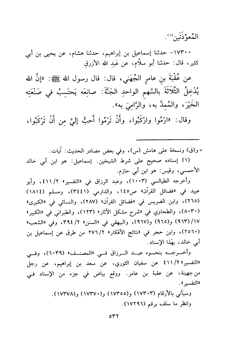 ١٧٣٠٠ - حَدَّثَنَا إِسْمَاعِيلُ بْنُ إِبْرَاهِيمَ، حَدَّثَنَا هِشَامٌ، عَنْ يَحْيَى بْنِ أَبِي كَثِيرٍ، قَالَ: حَدَّثَنَا أَبُو سَلَّامٍ، عَنْ عَبْدِ اللهِ الْأَزْرَقِ، عَنْ عُقْبَةَ بْنِ عَامِرٍ الْجُهَنِيِّ، قَالَ: قَالَ رَسُولُ اللهِ صَلَّى اللهُ عَلَيْهِ وَسَلَّمَ: " إِنَّ اللهَ عَزَّ وَجَلَّ يُدْخِلُ الثَّلَاثَةَ بِالسَّهْمِ الْوَاحِدِ الْجَنَّةَ: صَانِعَهُ يَحْتَسِبُ فِي صَنْعَتِهِ الْخَيْرَ، وَالْمُمِدَّ بِهِ، وَالرَّامِيَ بِهِ "