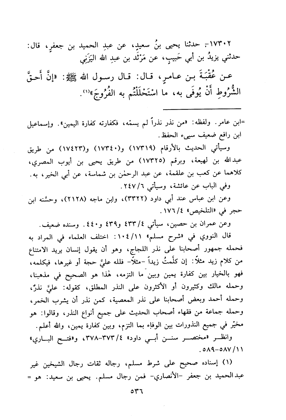 ١٧٣٠٢ - حَدَّثَنَا يَحْيَى بْنُ سَعِيدٍ، عَنْ عَبْدِ الْحَمِيدِ بْنِ جَعْفَرٍ، قَالَ: حَدَّثَنِي يَزِيدُ بْنُ أَبِي حَبِيبٍ، عَنْ مَرْثَدِ بْنِ عَبْدِ اللهِ الْيَزَنِيِّ، عَنْ عُقْبَةَ بْنِ عَامِرٍ، قَالَ: قَالَ رَسُولُ اللهِ صَلَّى اللهُ عَلَيْهِ وَسَلَّمَ: " إِنَّ أَحَقَّ الشُّرُوطِ أَنْ يُوَفَّى بِهِ، مَا اسْتَحْلَلْتُمْ بِهِ الْفُرُوجَ " (١)