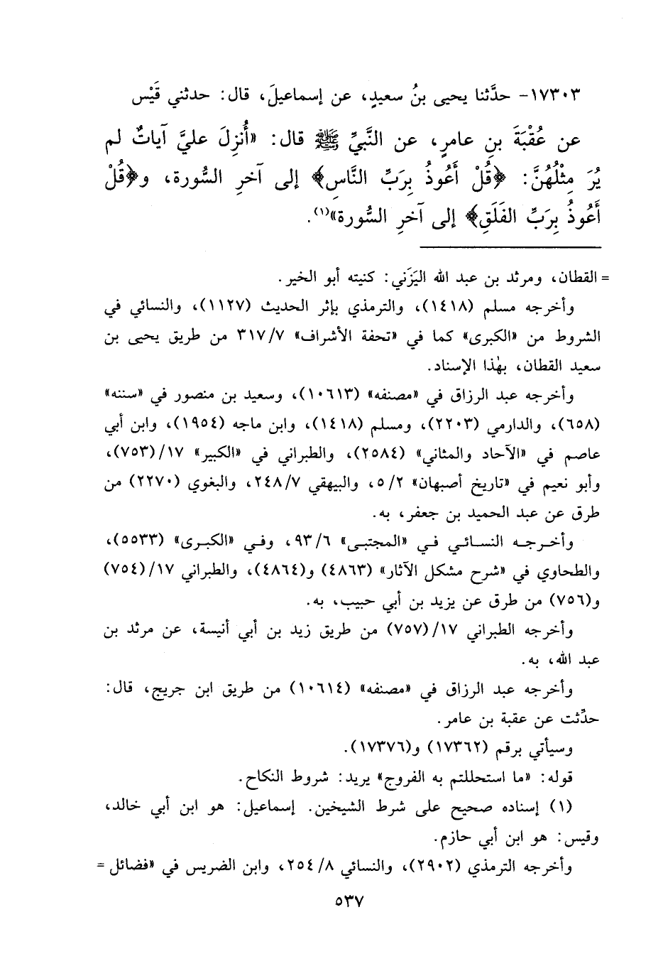 ١٧٣٠٣ - حَدَّثَنَا يَحْيَى بْنُ سَعِيدٍ، عَنْ إِسْمَاعِيلَ، قَالَ: حَدَّثَنِي قَيْسٌ، عَنْ عُقْبَةَ بْنِ عَامِرٍ، عَنِ النَّبِيِّ صَلَّى اللهُ عَلَيْهِ وَسَلَّمَ قَالَ: " أُنْزِلَتْ عَلَيَّ آيَاتٌ لَمْ يُرَ مِثْلُهُنَّ: قُلْ أَعُوذُ بِرَبِّ النَّاسِ إِلَى آخِرِ السُّورَةِ، وَقُلْ أَعُوذُ بِرَبِّ الْفَلَقِ إِلَى آخِرِ السُّورَةِ " (١)