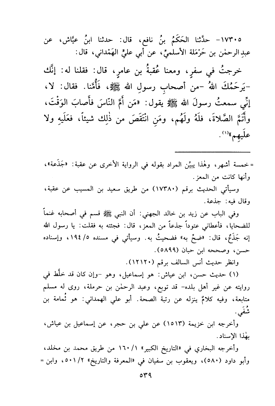 ١٧٣٠٥ - حَدَّثَنَا الْحَكَمُ بْنُ نَافِعٍ، قَالَ: حَدَّثَنَا ابْنُ عَيَّاشٍ، عَنْ عَبْدِ الرَّحْمَنِ بْنِ حَرْمَلَةَ الْأَسْلَمِيِّ، عَنْ أَبِي عَلِيٍّ الْهَمْدَانِيِّ، قَالَ: خَرَجْتُ فِي سَفَرٍ، وَمَعَنَا عُقْبَةُ بْنُ عَامِرٍ، قَالَ: فَقُلْنَا لَهُ: إِنَّكَ يَرْحَمُكَ اللهُ، مِنْ أَصْحَابِ رَسُولِ اللهِ صَلَّى اللهُ عَلَيْهِ وَسَلَّمَ، فَأُمَّنَا. فَقَالَ: لَا، إِنِّي سَمِعْتُ رَسُولَ اللهِ صَلَّى اللهُ عَلَيْهِ وَسَلَّمَ يَقُولُ: " مَنْ أَمَّ النَّاسَ فَأَصَابَ الْوَقْتَ، وَأَتَمَّ الصَّلَاةَ، فَلَهُ وَلَهُمْ، وَمَنْ انْتَقَصَ مِنْ ذَلِكَ شَيْئًا، فَعَلَيْهِ وَلَا عَلَيْهِمْ " (١)