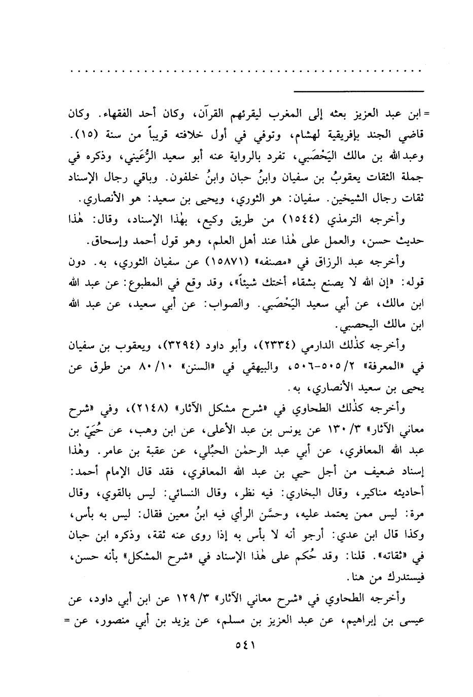 وعبد الله بن مالك اليَحْصَبي، تفرد بالرواية عنه أبو سعيد الرُّعَيني، وذكره في جملة الثقات يعقوبُ بن سفيان وابنُ حبان وابنُ خلفون. وباقي رجال الإسناد ثقات رجال الشيخين. سفيان: هو الثوري، ويحيى بن سعيد: هو الأنصاري.
