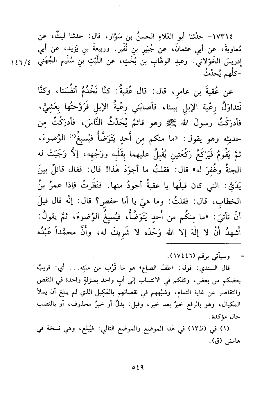 ١٧٣١٤ - حَدَّثَنَا أَبُو الْعَلَاءِ الْحَسَنُ بْنُ سَوَّارٍ، قَالَ: حَدَّثَنَا لَيْثٌ، عَنْ مُعَاوِيَةَ، عَنْ أَبِي عُثْمَانَ، عَنْ جُبَيْرِ بْنِ نُفَيْرٍ، وَرَبِيعَةُ بْنُ يَزِيدَ، عَنْ أَبِي إِدْرِيسَ الْخَوْلَانِيِّ، وَعَبْدُ الْوَهَّابِ بْنُ بُخْتٍ، عَنْ اللَّيْثِ بْنِ سُلَيْمٍ الْجُهَنِيِّ، كُلُّهُمْ يُحَدِّثُ، عَنْ عُقْبَةَ بْنِ عَامِرٍ قَالَ: قَالَ عُقْبَةُ: كُنَّا نَخْدُمُ أَنْفُسَنَا، وَكُنَّا نَتَدَاوَلُ رَعِيَّةَ الْإِبِلِ بَيْنَنَا، فَأَصَابَنِي رَعِيَّةُ الْإِبِلِ فَرَوَّحْتُهَا بِعَشِيٍّ، فَأَدْرَكْتُ رَسُولَ اللهِ صَلَّى اللهُ عَلَيْهِ وَسَلَّمَ وَهُوَ قَائِمٌ يُحَدِّثُ النَّاسَ، فَأَدْرَكْتُ مِنْ حَدِيثِهِ وَهُوَ يَقُولُ: " مَا مِنْكُمْ مِنْ أَحَدٍ يَتَوَضَّأُ فَيُسْبِغُ (١) الْوُضُوءَ، ثُمَّ يَقُومُ فَيَرْكَعُ رَكْعَتَيْنِ يُقْبِلُ عَلَيْهِمَا بِقَلْبِهِ وَوَجْهِهِ، إِلَّا وَجَبَتْ لَهُ الْجَنَّةُ وَغُفِرَ لَهُ " قَالَ: فَقُلْتُ: مَا أَجْوَدَ هَذَا قَالَ: فَقَالَ قَائِلٌ بَيْنَ يَدِي: الَّتِي كَانَ قَبْلَهَا: يَا عُقْبَةُ أَجْوَدُ مِنْهَا. فَنَظَرْتُ. فَإِذَا عُمَرُ بْنُ الْخَطَّابِ، قَالَ: فَقُلْتُ: وَمَا هِيَ يَا أَبَا حَفْصٍ؟ قَالَ: إِنَّهُ قَالَ قَبْلَ أَنْ تَأْتِيَ: " مَا مِنْكُمْ مِنْ أَحَدٍ يَتَوَضَّأُ، فَيُسْبِغُ الْوُضُوءَ، ثُمَّ يَقُولُ: أَشْهَدُ أَنْ لَا إِلَهَ إِلَّا اللهُ وَحْدَهُ لَا شَرِيكَ لَهُ، وَأَنَّ مُحَمَّدًا عَبْدُهُ