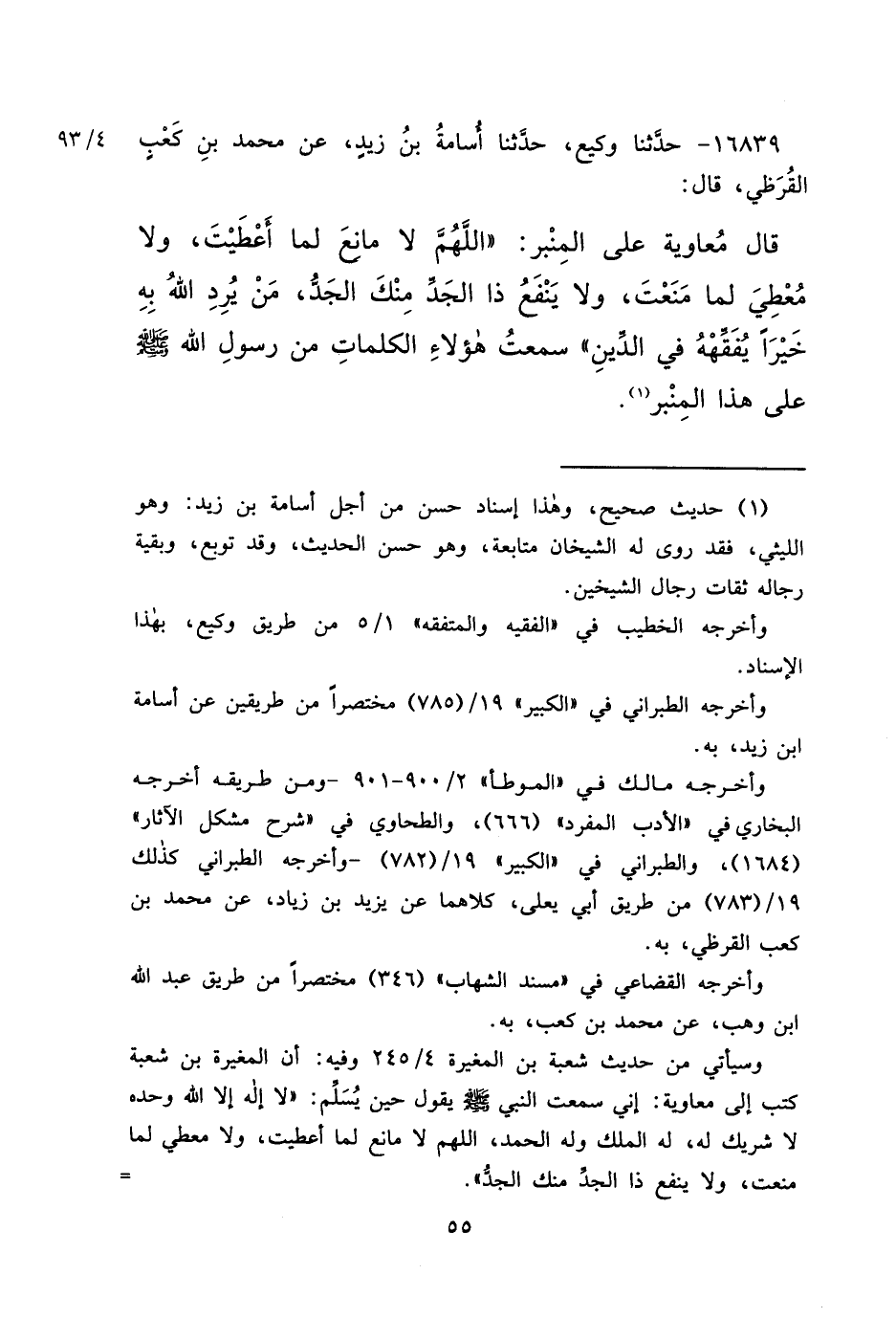 ١٦٨٣٩ - حَدَّثَنَا وَكِيعٌ، حَدَّثَنَا أُسَامَةُ بْنُ زَيْدٍ، عَنْ مُحَمَّدِ بْنِ كَعْبٍ الْقُرَظِيِّ، قَالَ: قَالَ مُعَاوِيَةُ عَلَى الْمِنْبَرِ: " اللهُمَّ لَا مَانِعَ لِمَا أَعْطَيْتَ، وَلَا مُعْطِيَ لِمَا مَنَعْتَ، وَلَا يَنْفَعُ ذَا الْجَدِّ مِنْكَ الْجَدُّ، مَنْ يُرِدِ اللهُ بِهِ خَيْرًا يُفَقِّهُّ فِي الدِّينِ " سَمِعْتُ هَؤُلَاءِ الْكَلِمَاتِ مِنْ رَسُولِ اللهِ صَلَّى اللهُ عَلَيْهِ وَسَلَّمَ عَلَى هَذَا الْمِنْبَرِ (١)