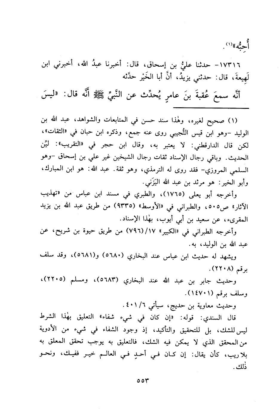 ١٧٣١٦ - حَدَّثَنَا عَلِيُّ بْنُ إِسْحَاقَ، قَالَ: أَخْبَرَنَا عَبْدُ اللهِ، أَخْبَرَنِي ابْنُ لَهِيعَةَ، قَالَ: حَدَّثَنِي يَزِيدُ، أَنَّ أَبَا الْخَيْرِ، حَدَّثَهُ، أَنَّهُ سَمِعَ عُقْبَةَ بْنَ عَامِرٍ، يُحَدِّثُ عَنِ النَّبِيِّ صَلَّى اللهُ عَلَيْهِ وَسَلَّمَ، أَنَّهُ قَالَ: " لَيْسَ