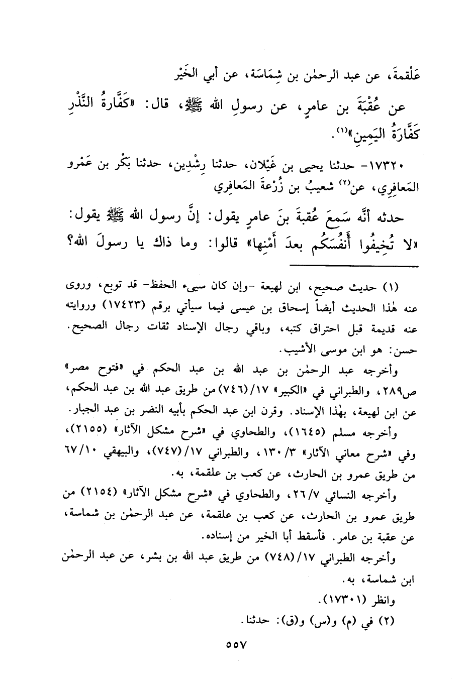 عَلْقَمَةَ، عَنْ عَبْدِ الرَّحْمَنِ بْنِ شِمَاسَةَ، عَنْ أَبِي الْخَيْرِ، عَنْ عُقْبَةَ بْنِ عَامِرٍ، عَنْ رَسُولِ اللهِ صَلَّى اللهُ عَلَيْهِ وَسَلَّمَ قَالَ: " كَفَّارَةُ النَّذْرِ كَفَّارَةُ الْيَمِينِ " (١)