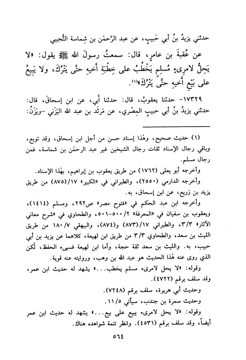 حَدَّثَنِي يَزِيدُ بْنُ أَبِي حَبِيبٍ، عَنْ عَبْدِ الرَّحْمَنِ بْنِ شِمَاسَةَ التُّجِيبِيِّ، عَنْ عُقْبَةَ بْنِ عَامِرٍ، قَالَ: سَمِعْتُ رَسُولَ اللهِ صَلَّى اللهُ عَلَيْهِ وَسَلَّمَ يَقُولُ: " لَا يَحِلُّ لِامْرِئٍ مُسْلِمٍ يَخْطُبُ عَلَى خِطْبَةِ أَخِيهِ حَتَّى يَتْرُكَ، وَلَا يَبِيعُ عَلَى بَيْعِ أَخِيهِ حَتَّى يَتْرُكَ " (١)