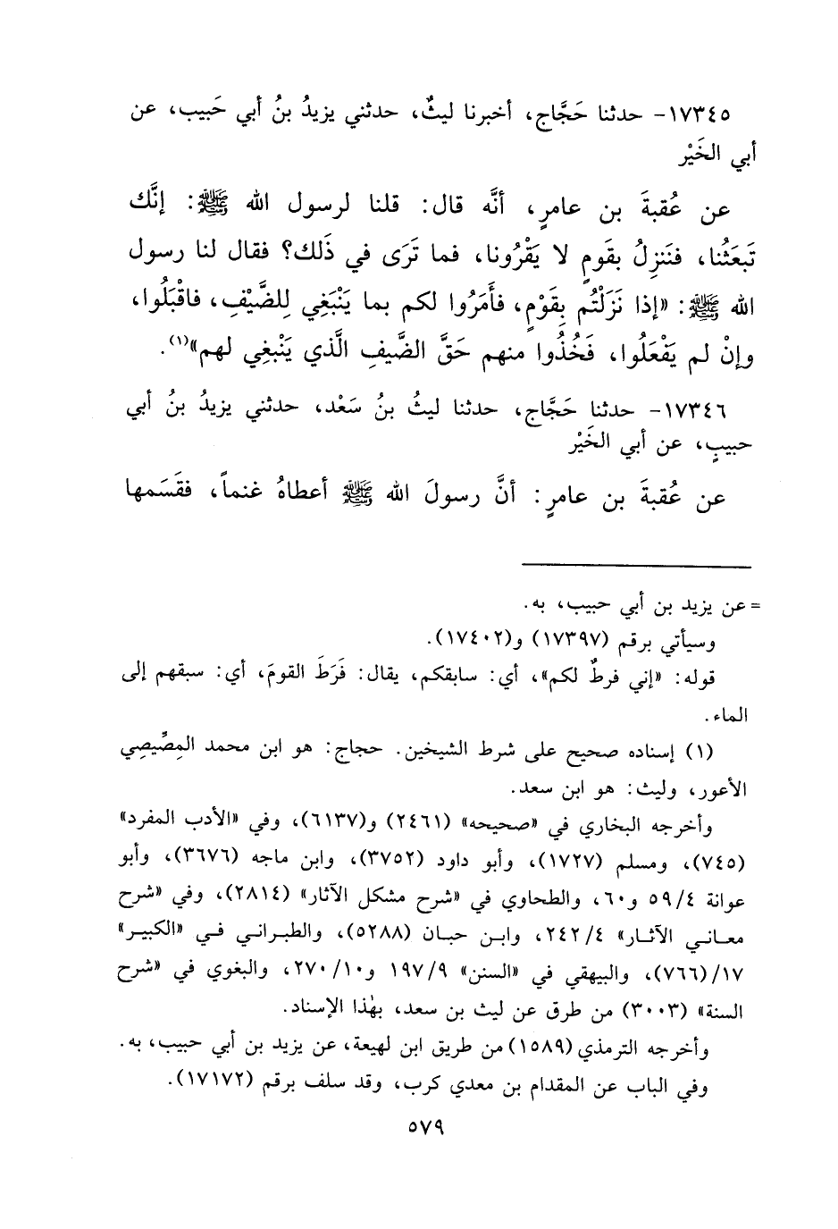 ١٧٣٤٥ - حَدَّثَنَا حَجَّاجٌ، أَخْبَرَنَا لَيْثٌ، حَدَّثَنِي يَزِيدُ بْنُ أَبِي حَبِيبٍ، عَنْ أَبِي الْخَيْرِ، عَنْ عُقْبَةَ بْنِ عَامِرٍ، أَنَّهُ قَالَ: قُلْنَا لِرَسُولِ اللهِ صَلَّى اللهُ عَلَيْهِ وَسَلَّمَ: إِنَّكَ تَبْعَثُنَا، فَنَنْزِلُ بِقَوْمٍ لَا يَقْرُونَا، فَمَا تَرَى فِي ذَلِكَ؟ فَقَالَ لَنَا رَسُولُ اللهِ صَلَّى اللهُ عَلَيْهِ وَسَلَّمَ: " إِذَا نَزَلْتُمْ بِقَوْمٍ، فَأَمَرُوا لَكُمْ بِمَا يَنْبَغِي لِلضَّيْفِ، فَاقْبَلُوا، وَإِنْ لَمْ يَفْعَلُوا، فَخُذُوا مِنْهُمْ حَقَّ الضَّيْفِ الَّذِي يَنْبَغِي لَهُمْ " (١)