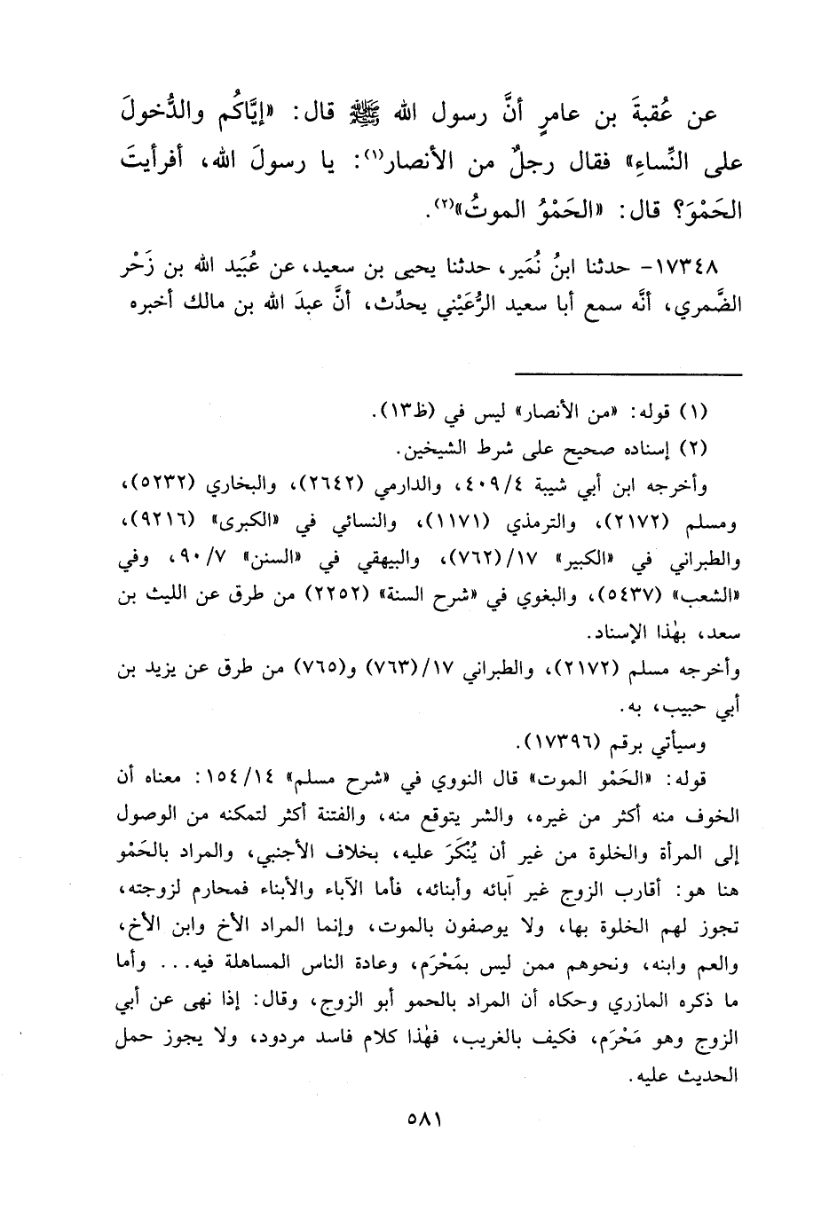 عَنْ عُقْبَةَ بْنِ عَامِرٍ، أَنَّ رَسُولَ اللهِ صَلَّى اللهُ عَلَيْهِ وَسَلَّمَ قَالَ: " إِيَّاكُمْ وَالدُّخُولَ عَلَى النِّسَاءِ " فَقَالَ رَجُلٌ مِنَ الْأَنْصَارِ (١) : يَا رَسُولَ اللهِ، أَفَرَأَيْتَ الْحَمْوَ؟ قَالَ: " الْحَمْوُ الْمَوْتُ " (٢)